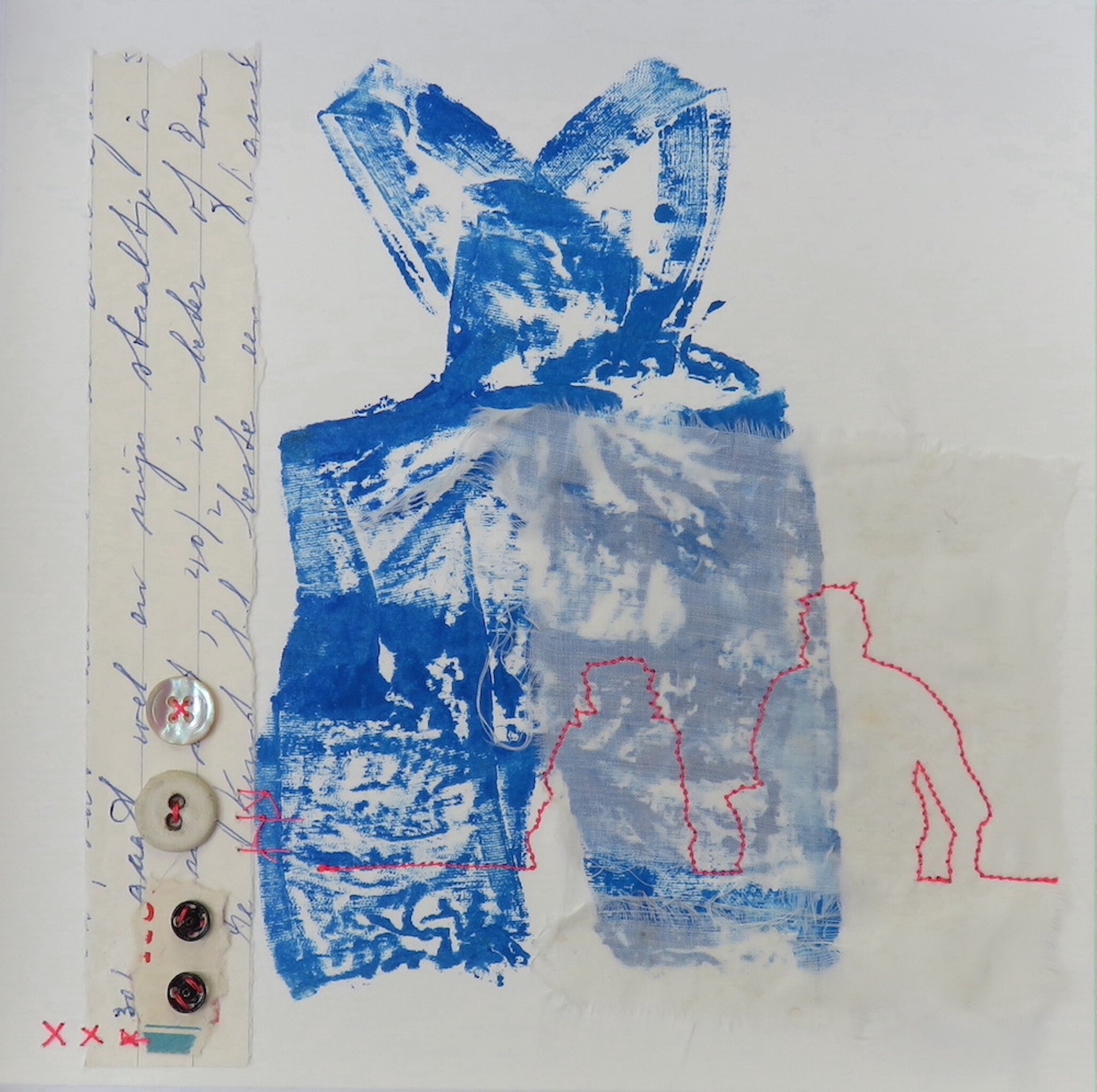 Collage in printtechniek, van oud handschrift, knoopjes, textiel, garen.