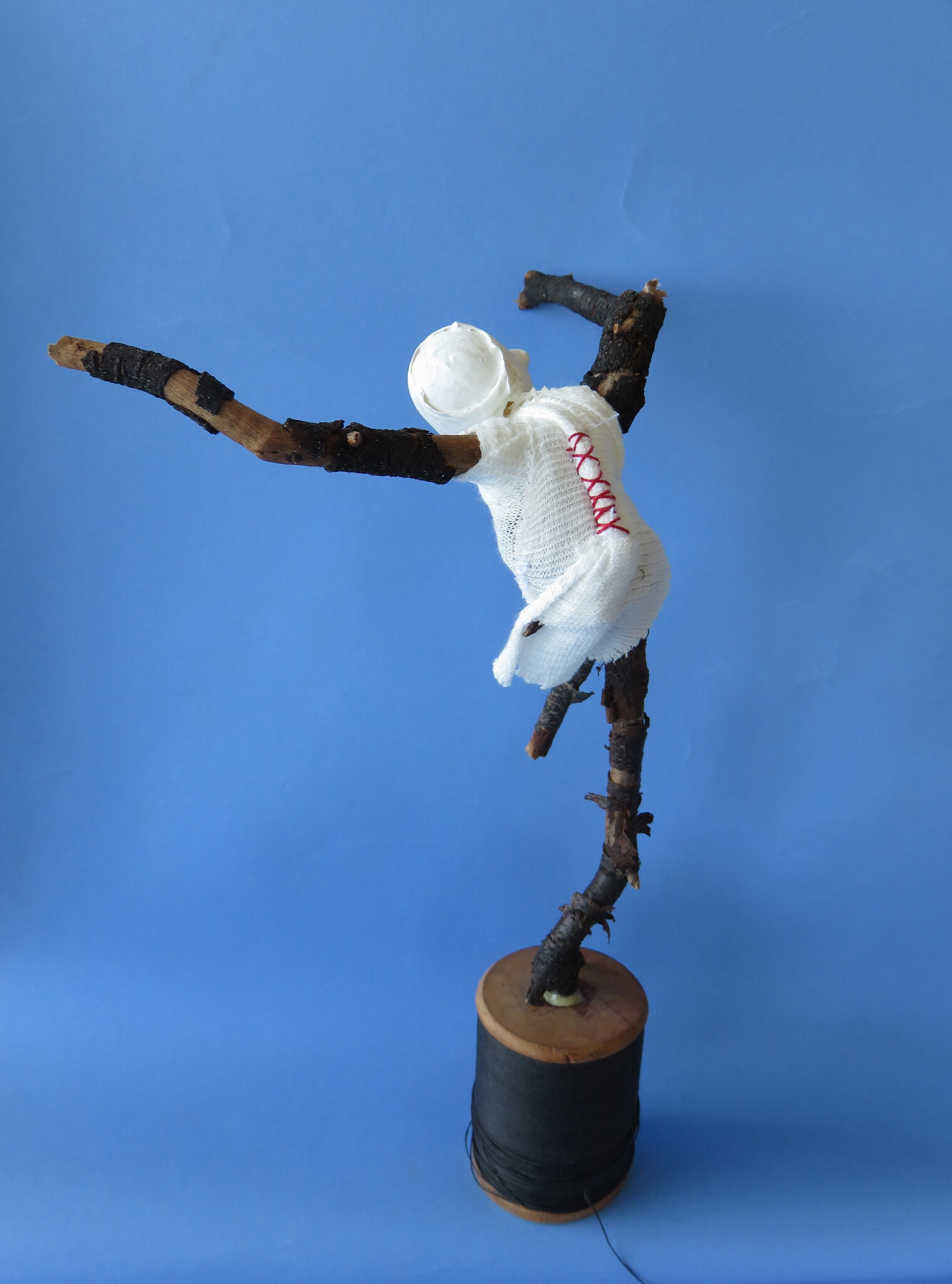 Kleine sculptuur van hout, tetxtiel, garen, plastic.