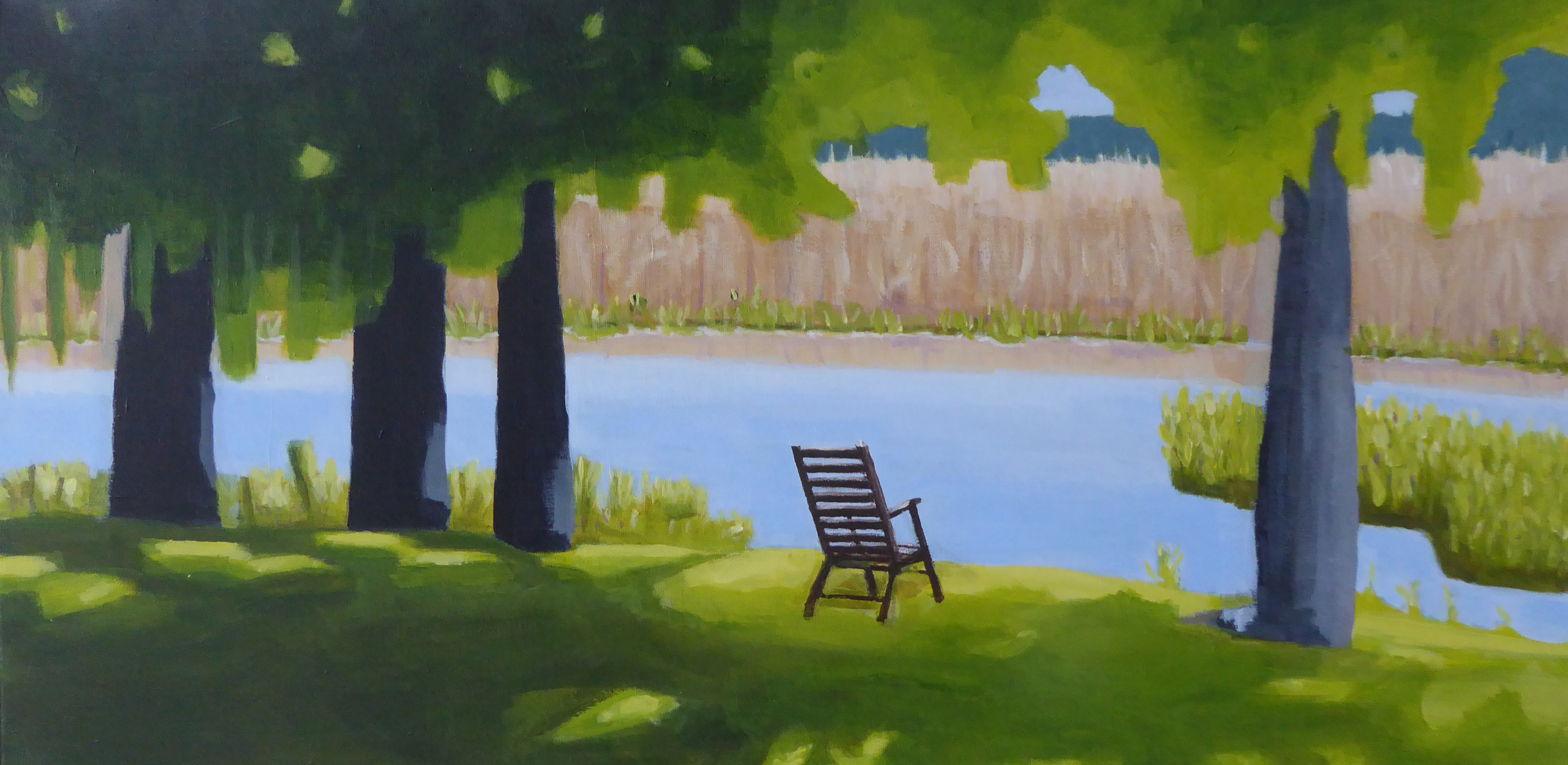 Een warme zomermiddag. Stilte aan het water. Alleen het kabbelen van het water en af en toe de roep van een vogel. De stoel nodigt je uit om te gaan zitten in de schaduw. Voor lezers en dromers.