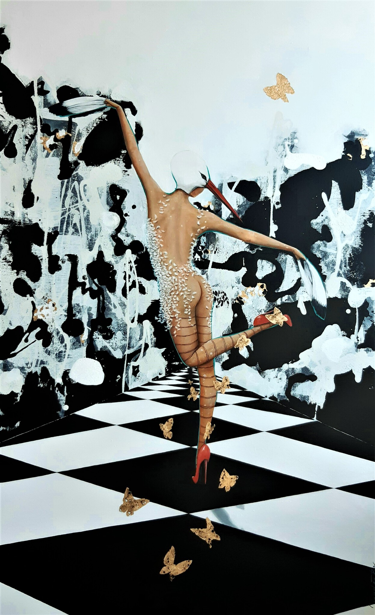 Sold Schilderij van een vogelvrouw die over een pad loopt in een zwart witte wereld. gouden vlinders begeleiden haar pad. Afmeting 110x70cm
