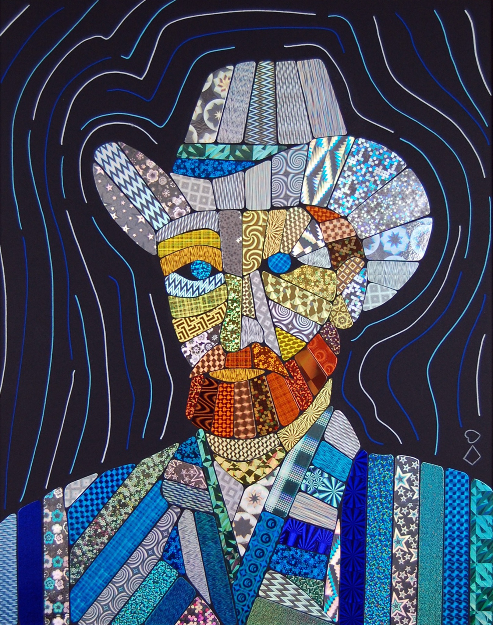 Vincent van Gogh heeft een bepaalde schildertechniek waardoor er uit lijnen en strepen een beeld ontstaat. Deze techniek heb ik in één van zijn bekende zelfportretten overgenomen in mijn gebruikelijk materiaal: holografisch papier. De achtergond heb ik bewerkt met blauwe en witte strepen.