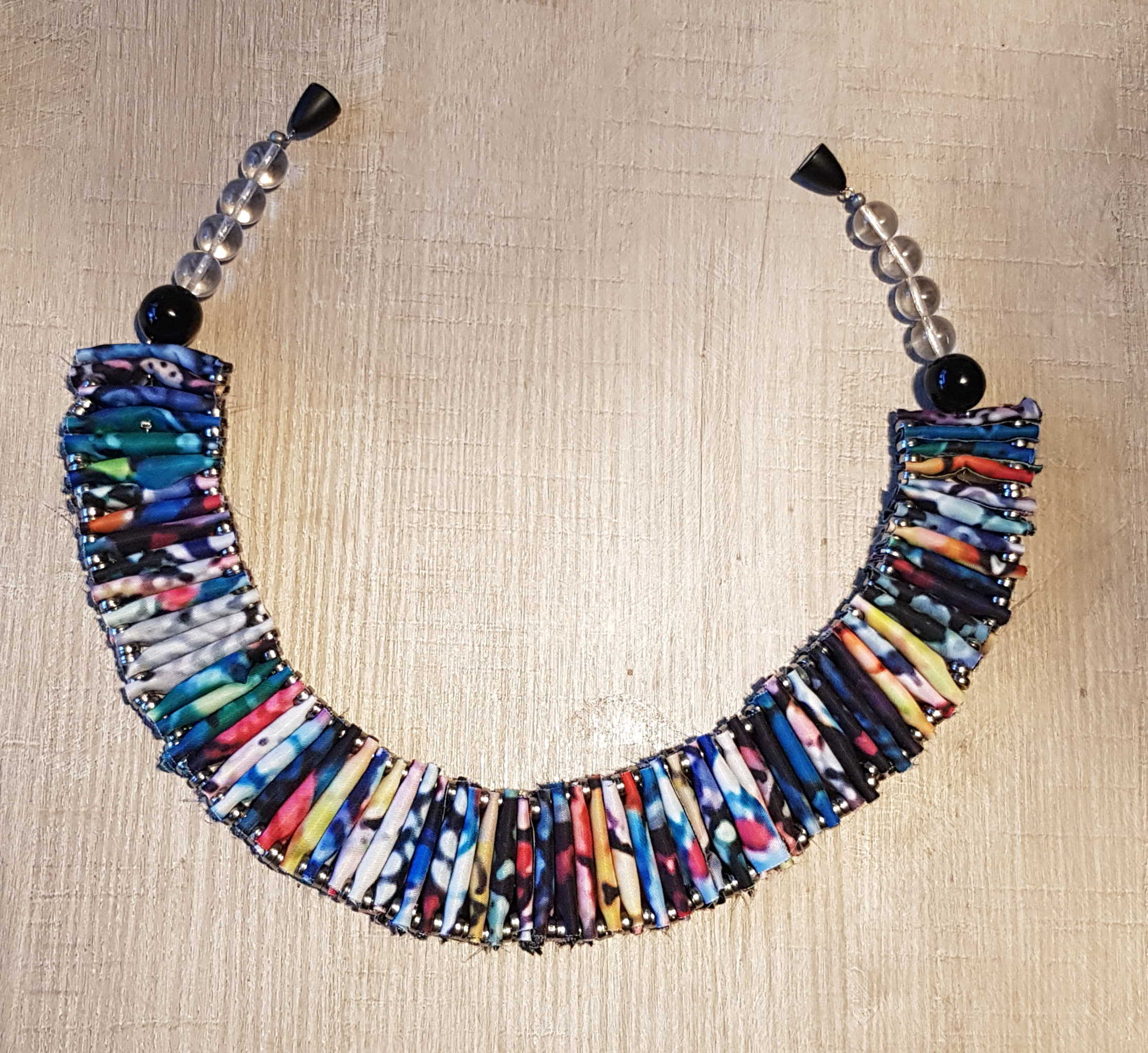 Reststukjes stof aan elkaar genaaid met zilverkleurige kraaltjes