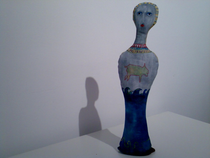 jeans stof beschilderd kan zelfstandig staan,hoogte gemiddeld 60cm. De voorkant.