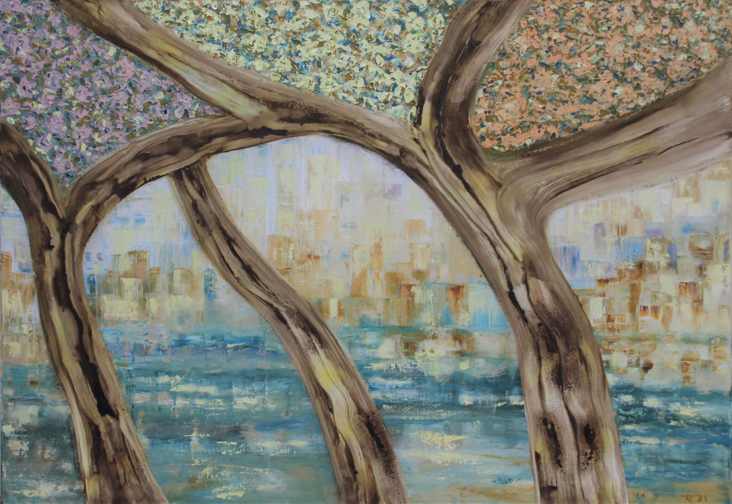Oude bloesembomen op voorgrond, met op de achtergrond een stad