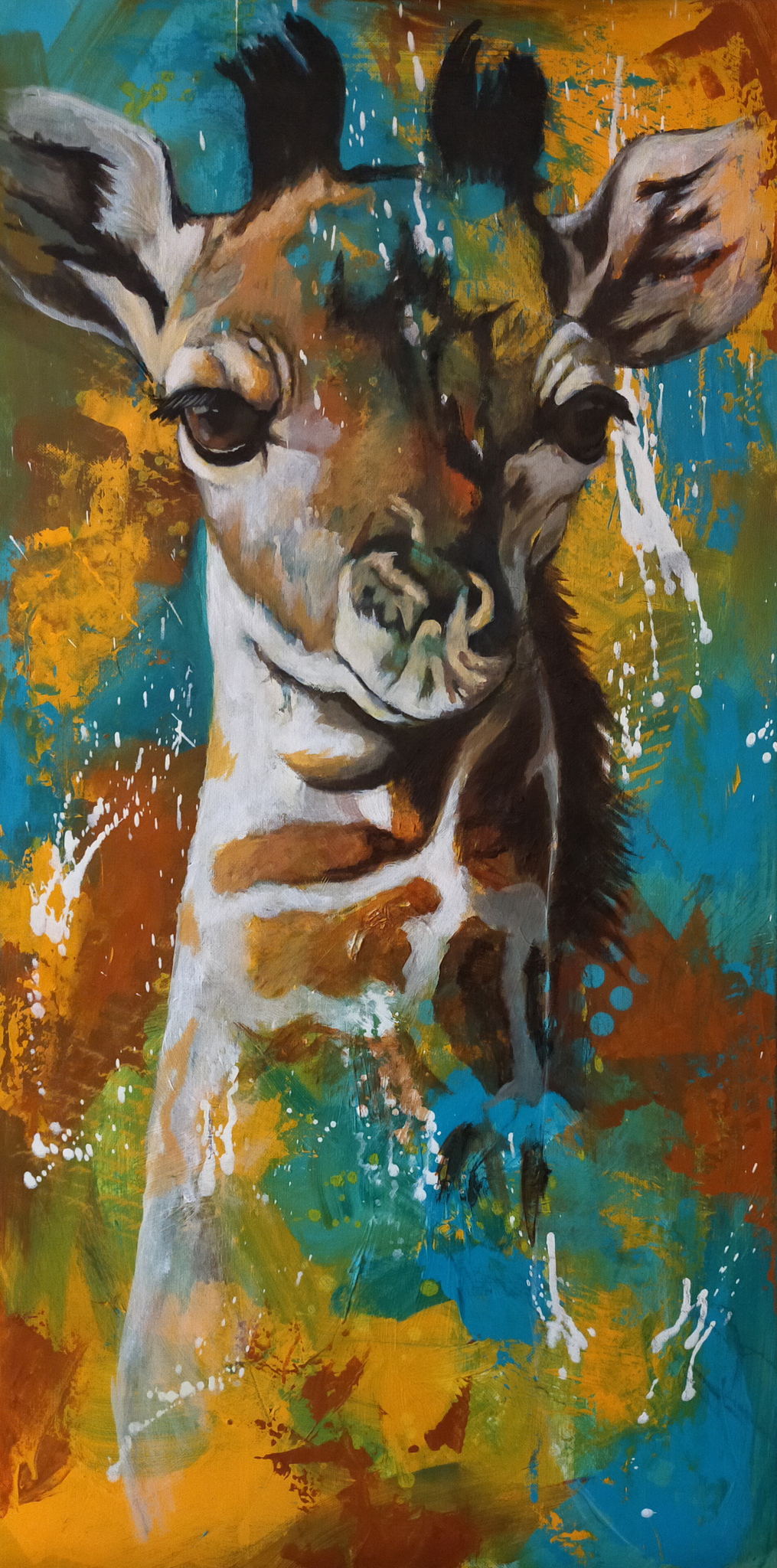 Deze kleine giraffe lieve giraffe is geschildered in een experimentele achtergrond in acryl.