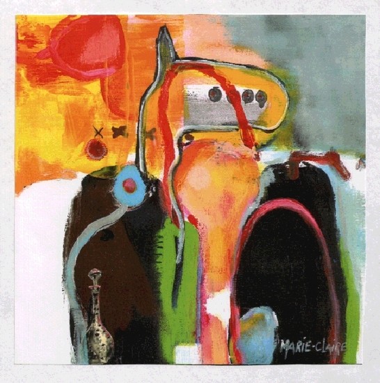 de werken van marie-claire getuigen van vitaliteit en spontaniteit,waarbij ze het experiment duidelijk niet schuwt. Op een persoonlijke,manier speelt ze met het medium gemengde techniek.Dit betekent dat ze naast de gebruikelijke materialen als bijv. verf krijt en potlood ook gebruik maakt van allerlei gevonden elementen van knipsels hout speelgoed ingeplakte tekeningen enz.