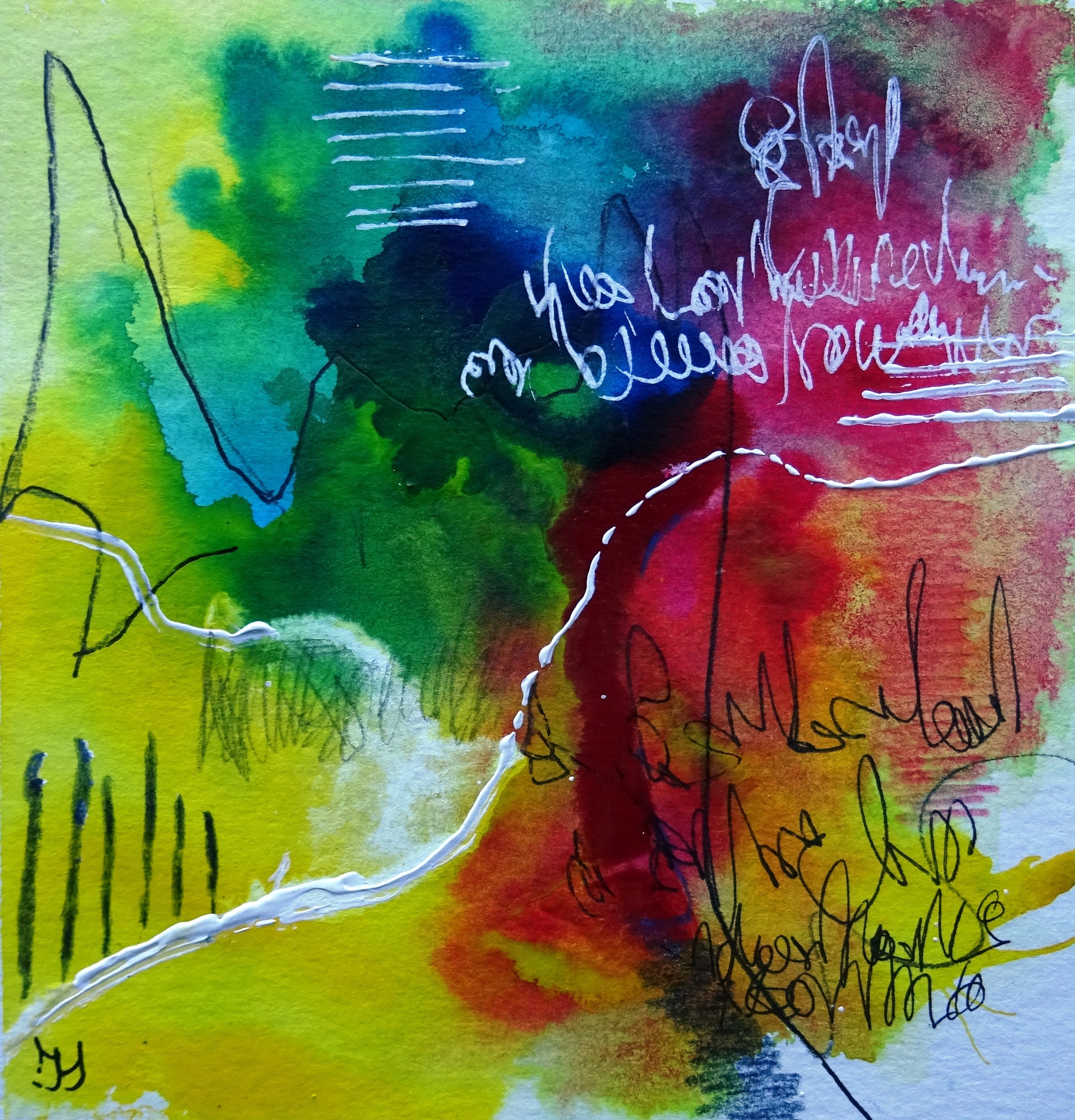 Schilderij geschilderd met Acryl Gouache op papier. Diverse materialen gebruikt zoals, potlood Krijt inkt.