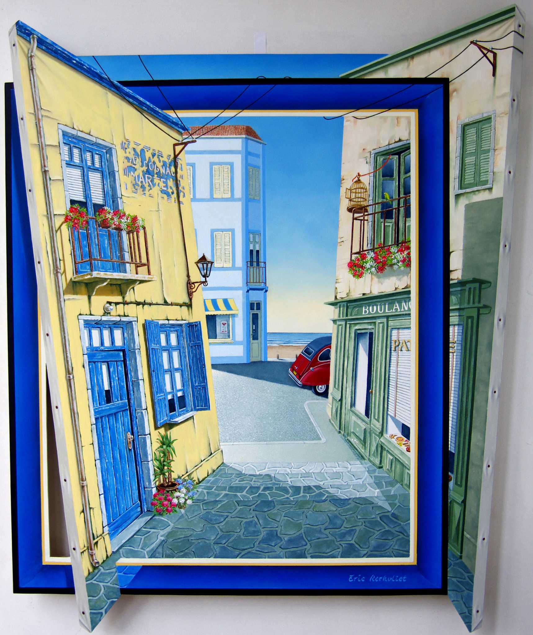 Eric Kerkvliet schildert met olieverf uiterst gedetailleerd voorstellingen op iets verhoogd paneel waardoor bij juiste belichting een Trompe-l’oeil-achtig effect ontstaat.