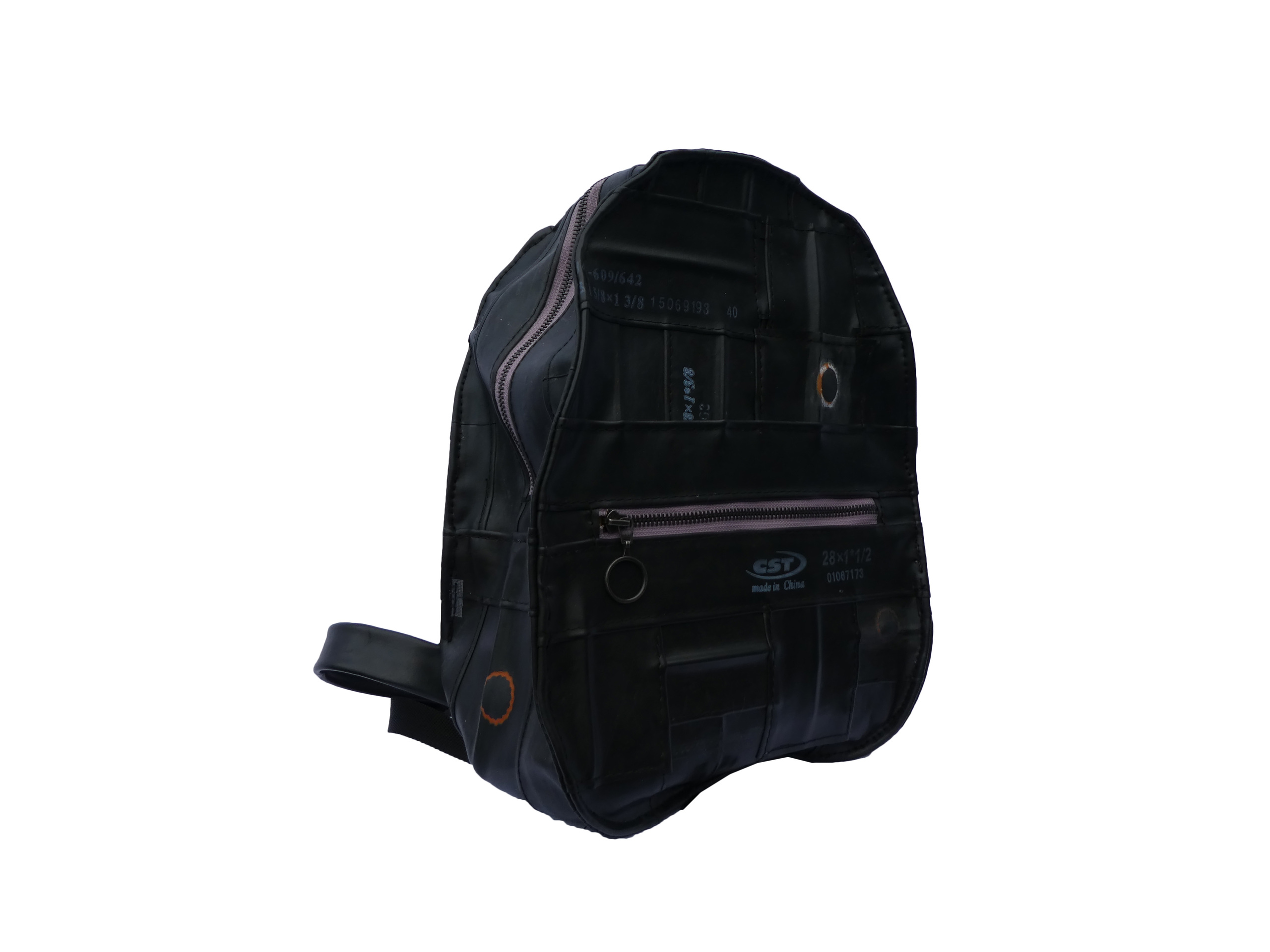 Deze tabs toelopende rugzak is in zijn geheel gemaakt van gerecycled fietsbinnenband in patchwork. Aan de voorzijde is een ritsvak voor veelgebruikte items, die je snel nodig hebt en is de opdruk van een fietsbinnenbandenmerk verwerkt en 2 keer “pech onderweg”. De voering is van plastic . Tweede ritsvak zit aan de binnenzijde in rugpand. De draagbanden van verstevigd fietsbinnenband zijn verstelbaar in lengte. De rugzak sluit met een rits. Rugzakken vergroten je draagvermogen zonder jou in je bewegingsvrijheid te beperken en is daarom populair, Titato is ook nog eens waterdicht . Een unieke eye-catcher met een smile….