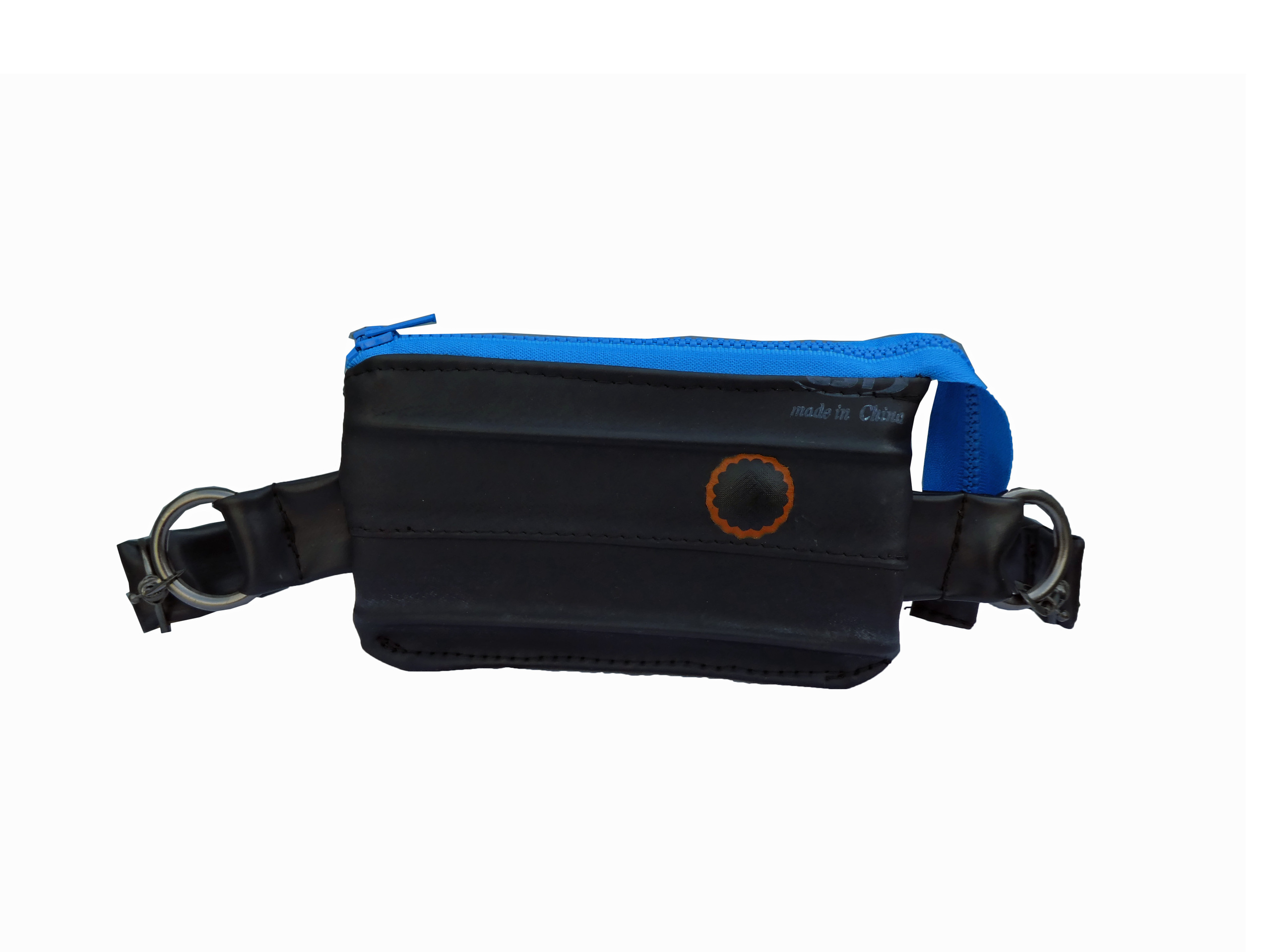 Kontigo Lengte : 18 cm Hoogte : 12 cm Breedte : 2 tot 6 cm Dit is een heuptas geheel gemaakt van gerecycled fietsbinnenband met een felblauwe rits. De voering is zacht velours waar de felblauwe kleur van de rits in terugkomt. Als je de rits opent heb je 3 vakken. De comfortabele heupband is van verstevigd fietsbinnenband en is verstelbaar in lengte. De opdruk van een fietsbinnenband zie je terug, zo ook een originele plakker van ‘pech onderweg’. Eyecatcher zijn de ringen en karabijnen aan weerskanten, die de tas met de heupband verbind.