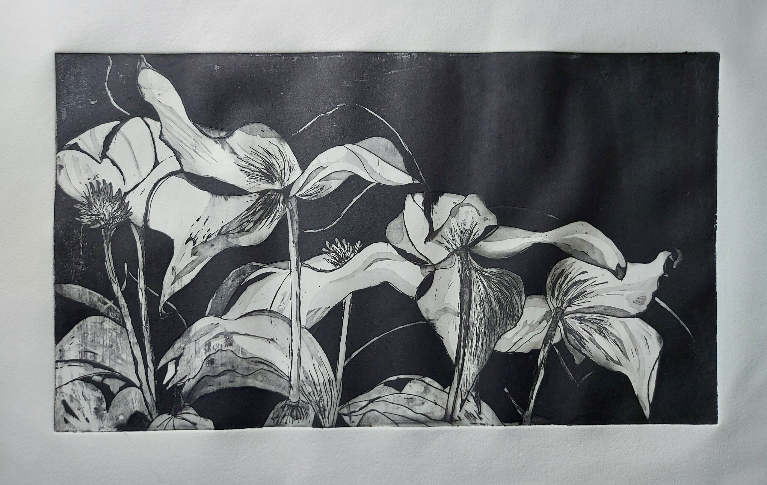 Kornoelje bloeiwijze, zwart wit ets. Hoogte en breedte is de druk zelf. Papier is groter. Prijs zonder lijst.