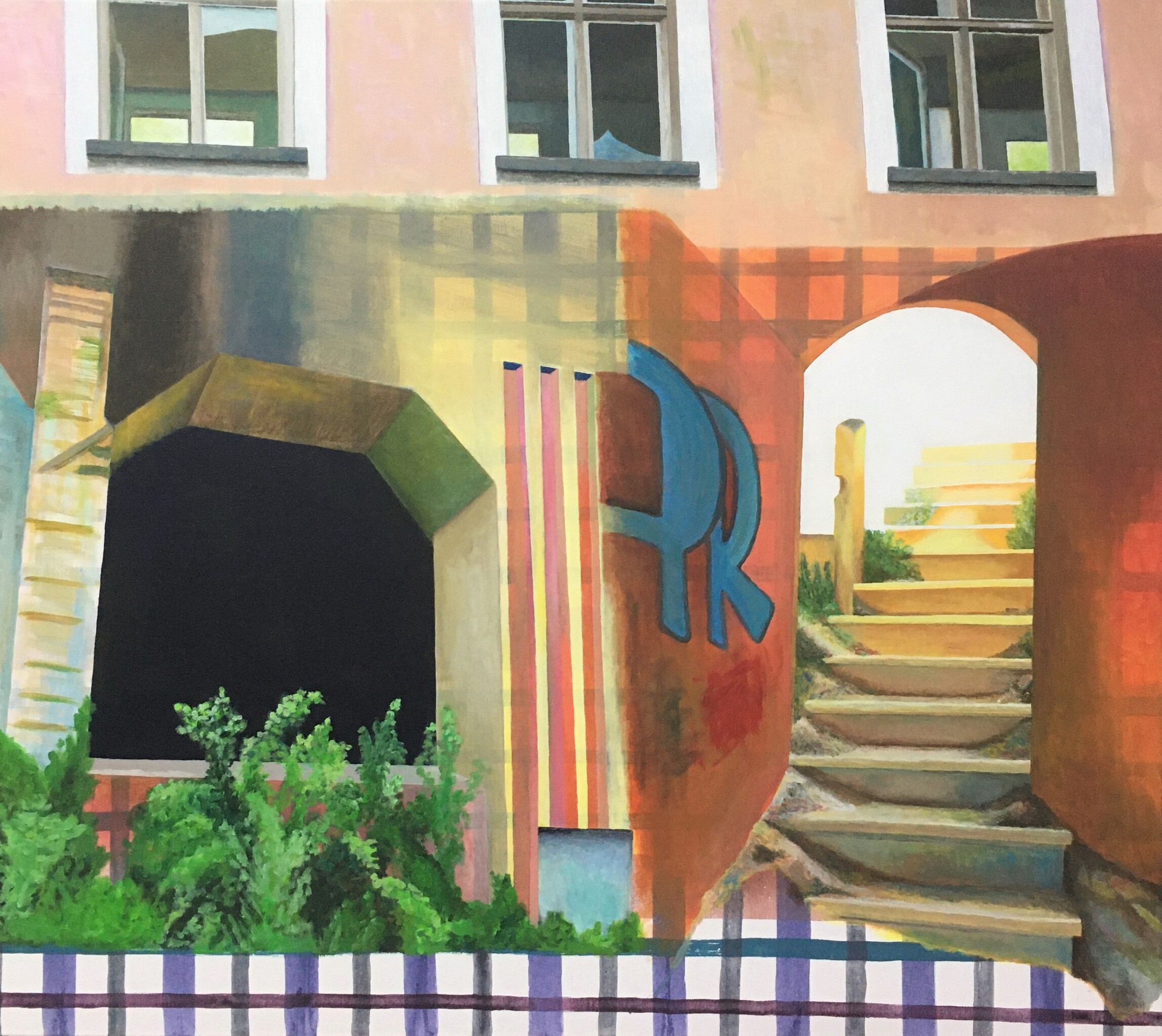 Schilderij Oranje Collage Trap Gebouwen Ramen Gevel Diepte Bouwwerken Doorkijk Flarden