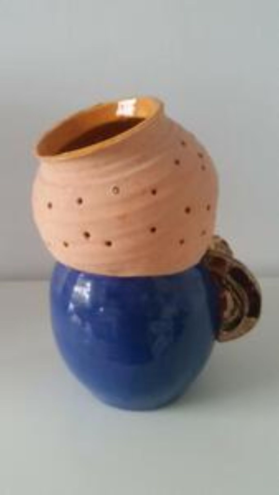 Een keramisch object ontstaan uit verschillende vormen die samengevoegd zijn. Kleurrijk door de kleur blauw en oranje