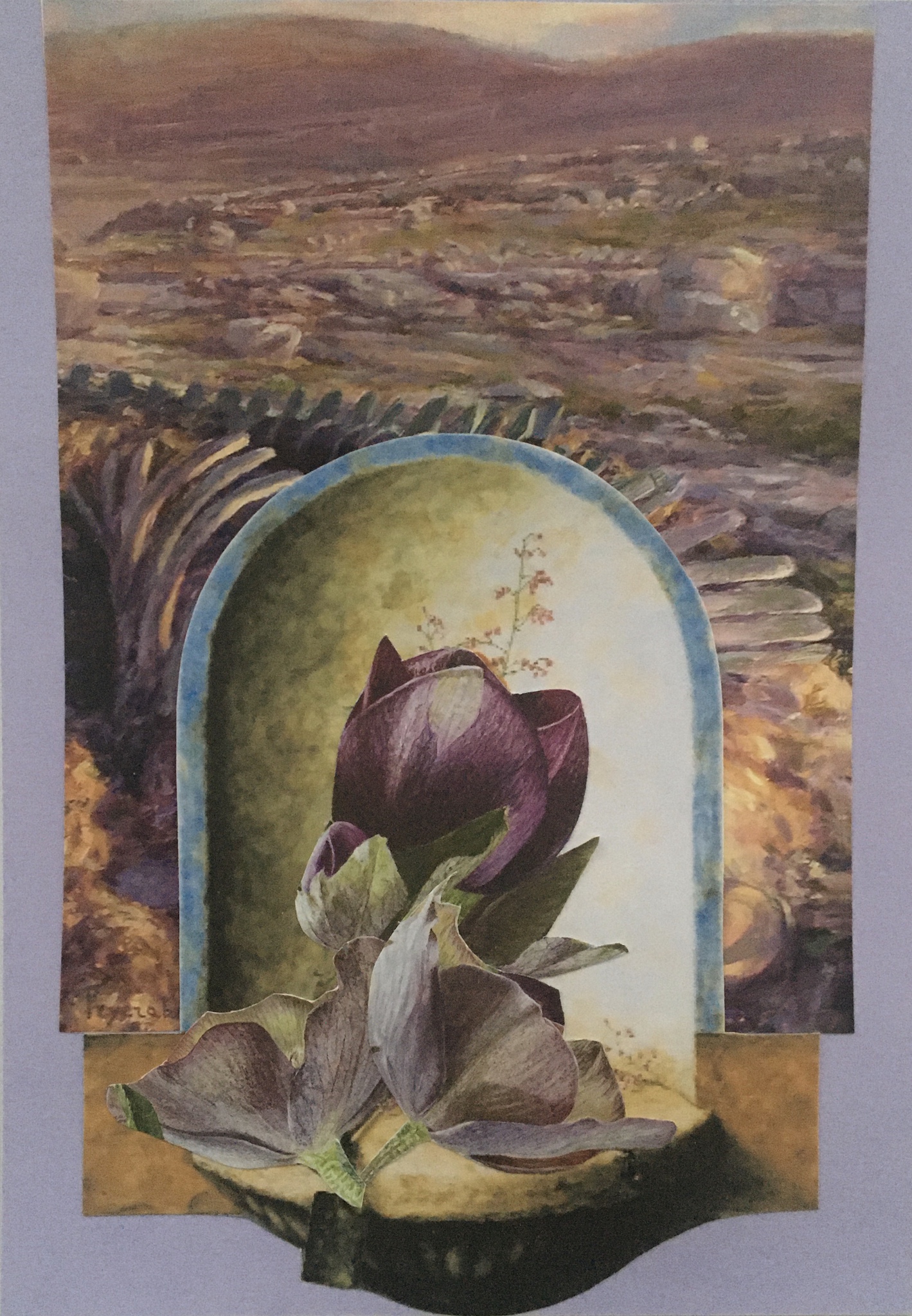 Paars Bloemen Landschap Collage Papier Verhalend Surreeel Papierkunst Lijm Schaar Spiritueel Collagecoaching Coach Interpreteren Vertalen Papierkunstenaar Intuïtief Flow Kleurig Bewegend Positief Boodschap Kunstenaar Spiegel Artiest