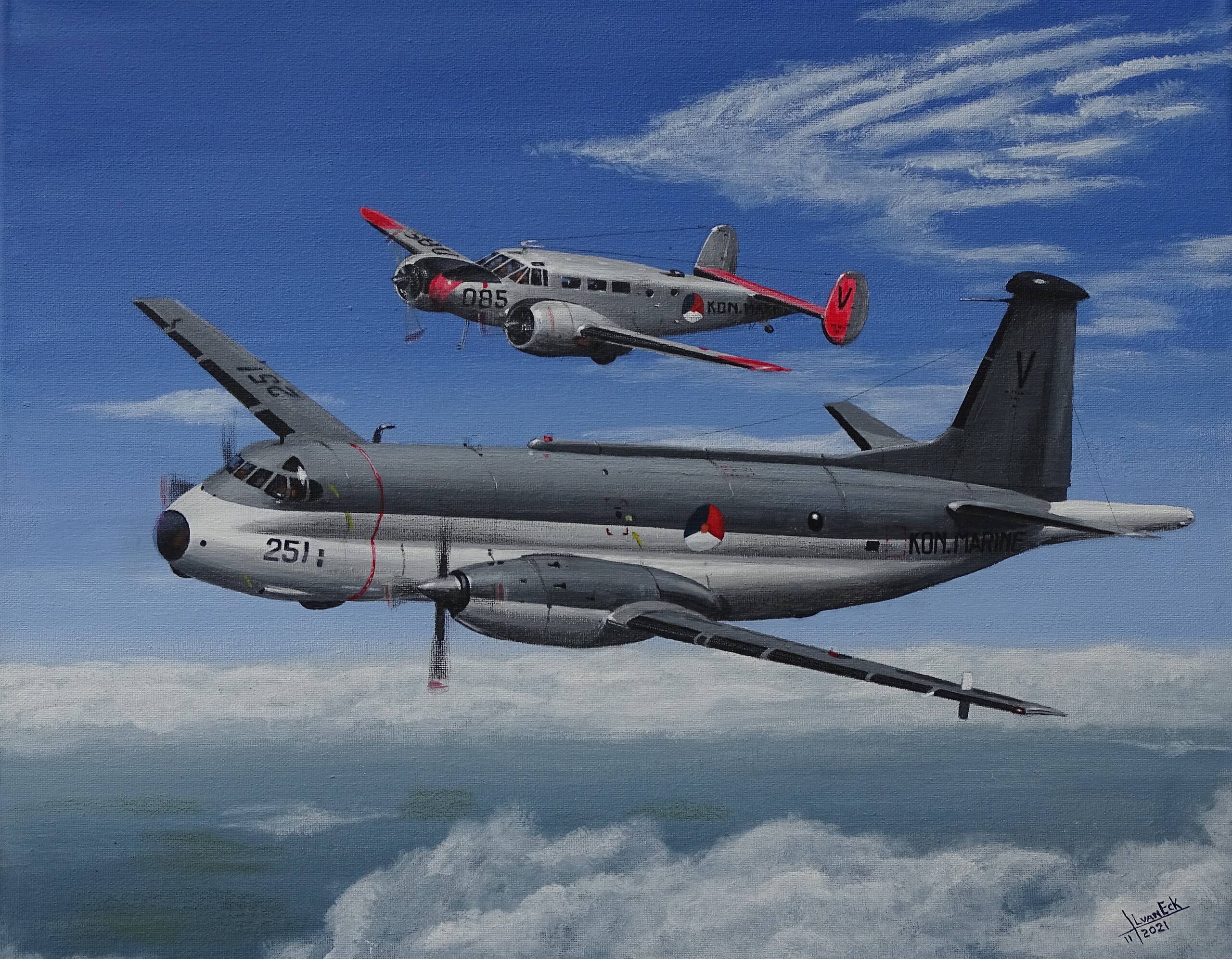 Een Brequet Atlantic en een Beechcraft TC45 vliegen in formatie. De negen Brequet Atlantic's waren gestationeerd op vliegveld Valkenburg bij SQN 321 in de jaren 1969 tot 1985. Ze werden gebruikt als patrouillevliegtuig, voor opsporing, reddingsvluchten en voor onderzeebootbestrijding. De zes Beechcraft TC-45j Navigators waren ook gestationeerd op vliegveld Valkenburg bij SQN 5 in de jaren 1953 tot 1974 voor de opleiding van vliegers, waarnemers en telegrafisten.