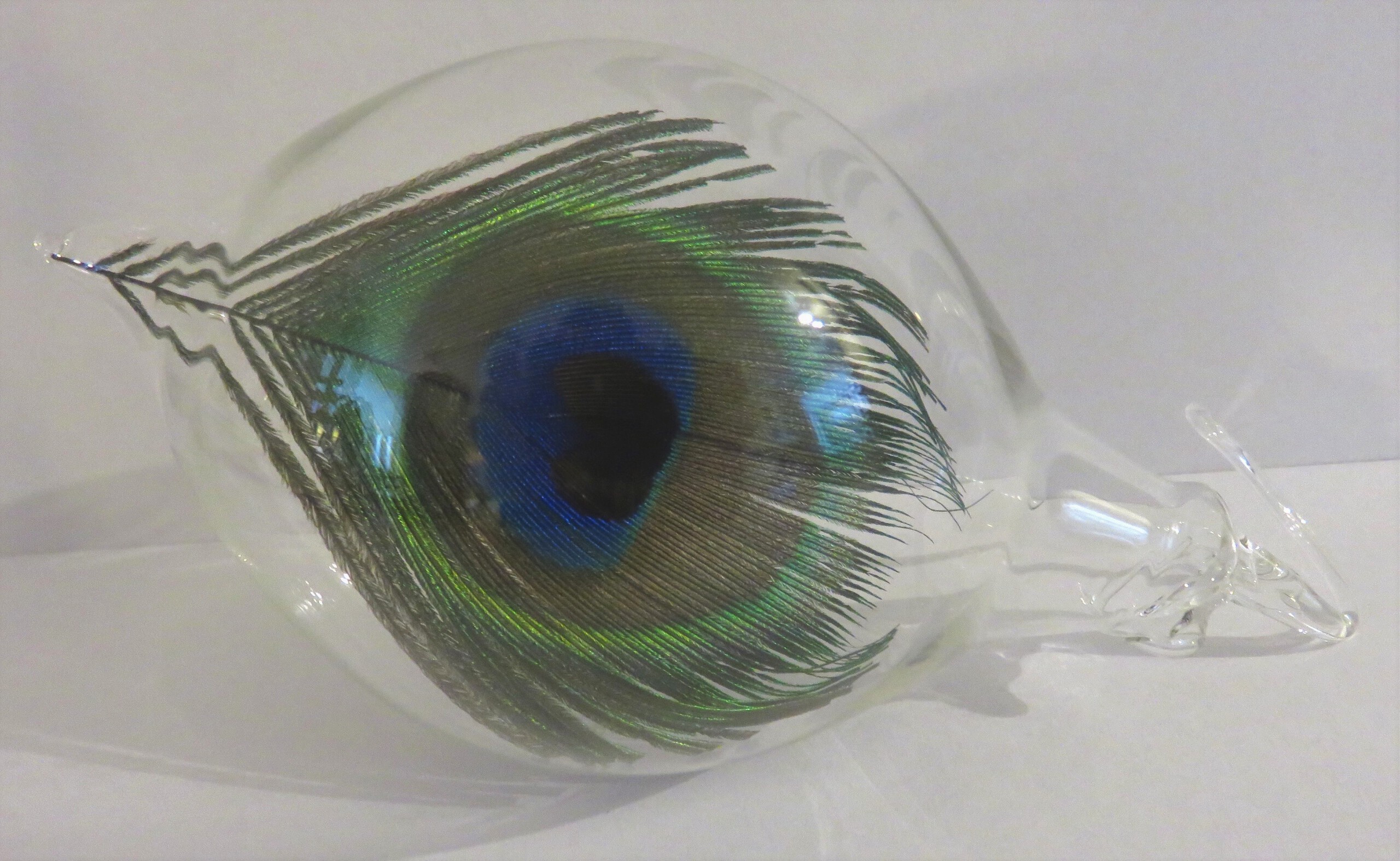 Een mondgeblazen bal met een mooie pauwveer. Nostalgie een mooie bal in de kerstboom