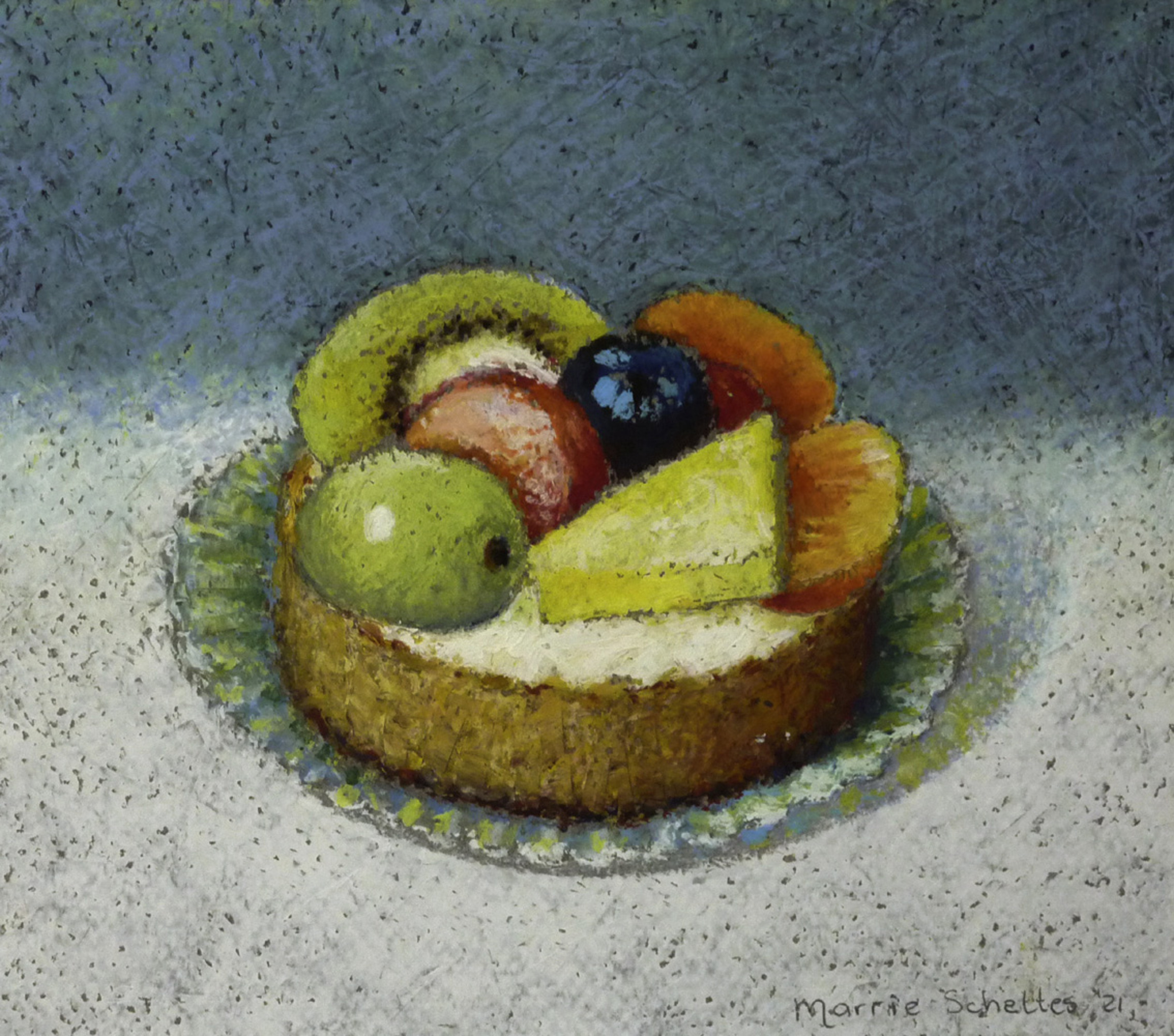 Vruchtengebakje in oliepastelkrijt. passe-partout/lijstmaat 30x30 cm.