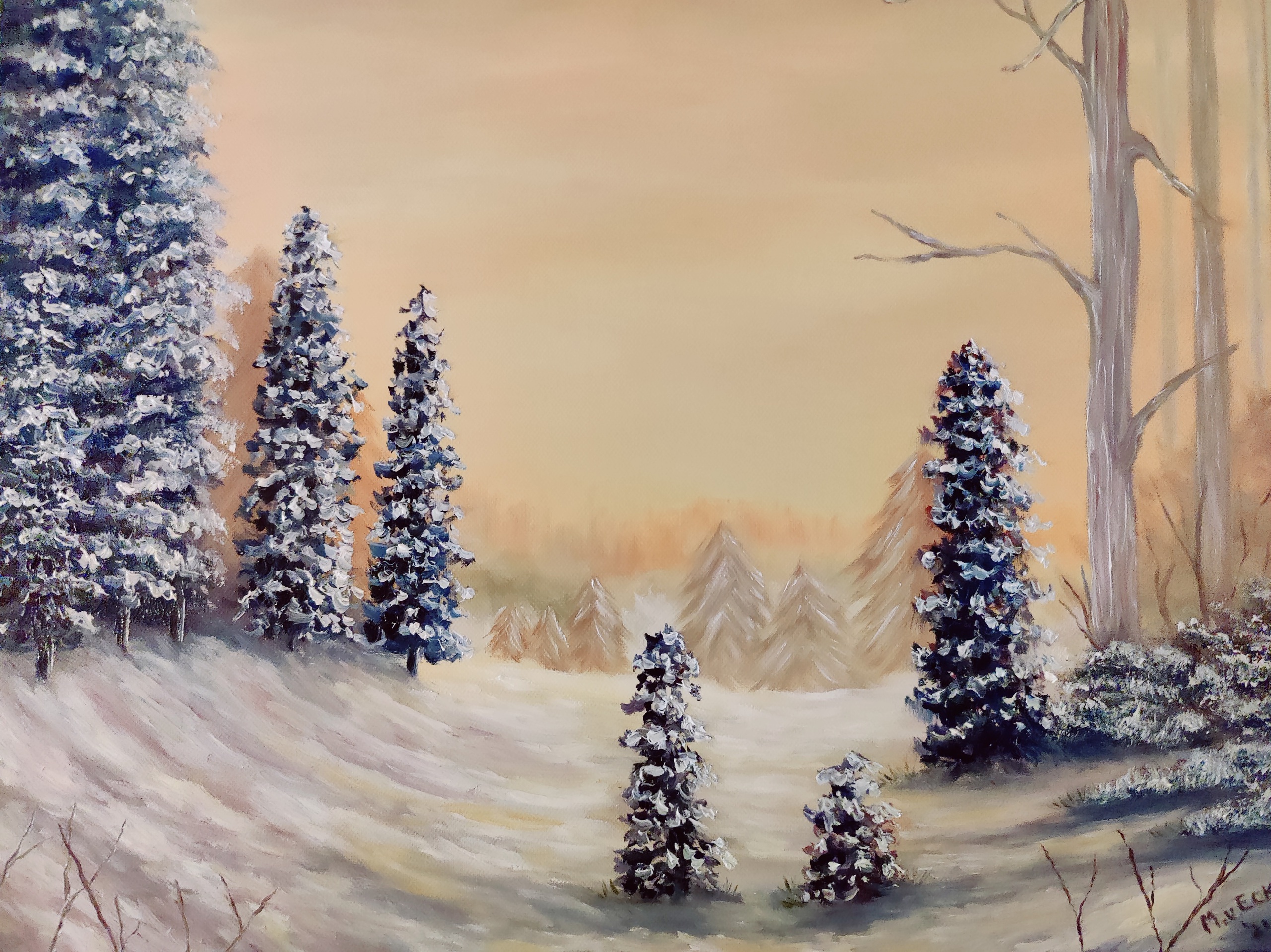 Winter Forest, olieverf op doek, Merel van Eck 2021. Dit schilderij is gebaseerd op een tutorial van Kevin Hill.