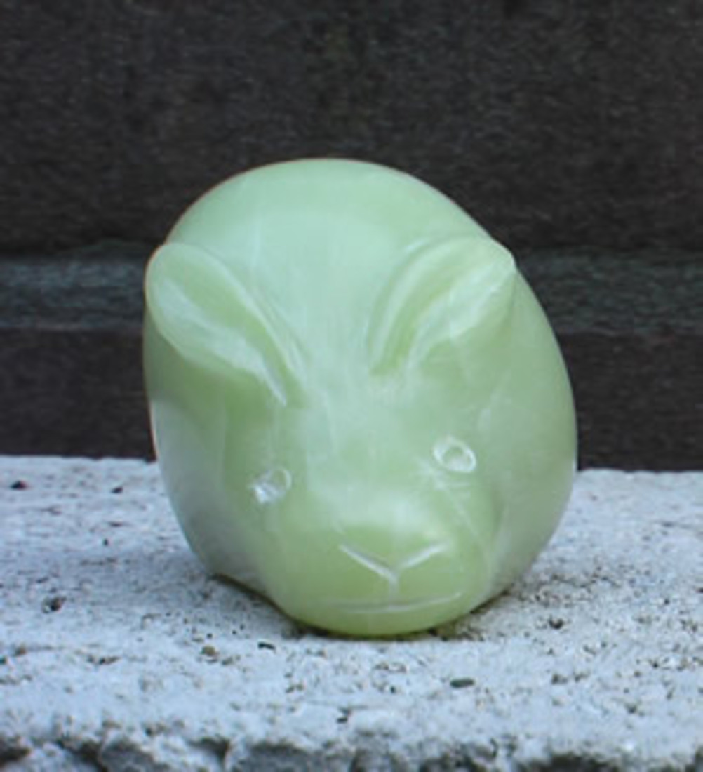 Konijntje Materiaal: Groene Chinese speksteen - Gewicht: 0,5 kg Prijs: op aanvraag Gemaakt in: Wenum, 2013 Opmerking: Unica, mini-beeldje.