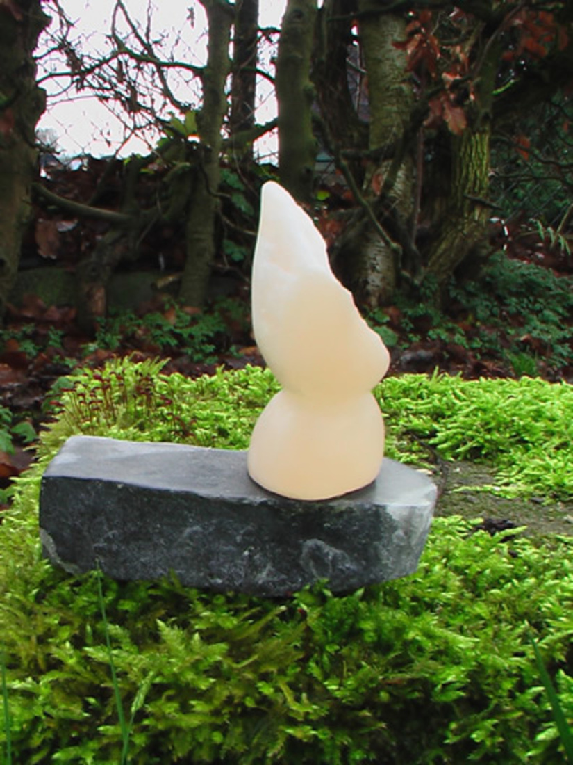 Vlammetje Materiaal: Turks oranje Seleniet op stukje Chinese zwartwitte speksteen - Gewicht: 0,5 kg Prijs: op aanvraag Gemaakt in: Wenum Wiesel, 2015 Opmerking: Unica, mini-beeldje