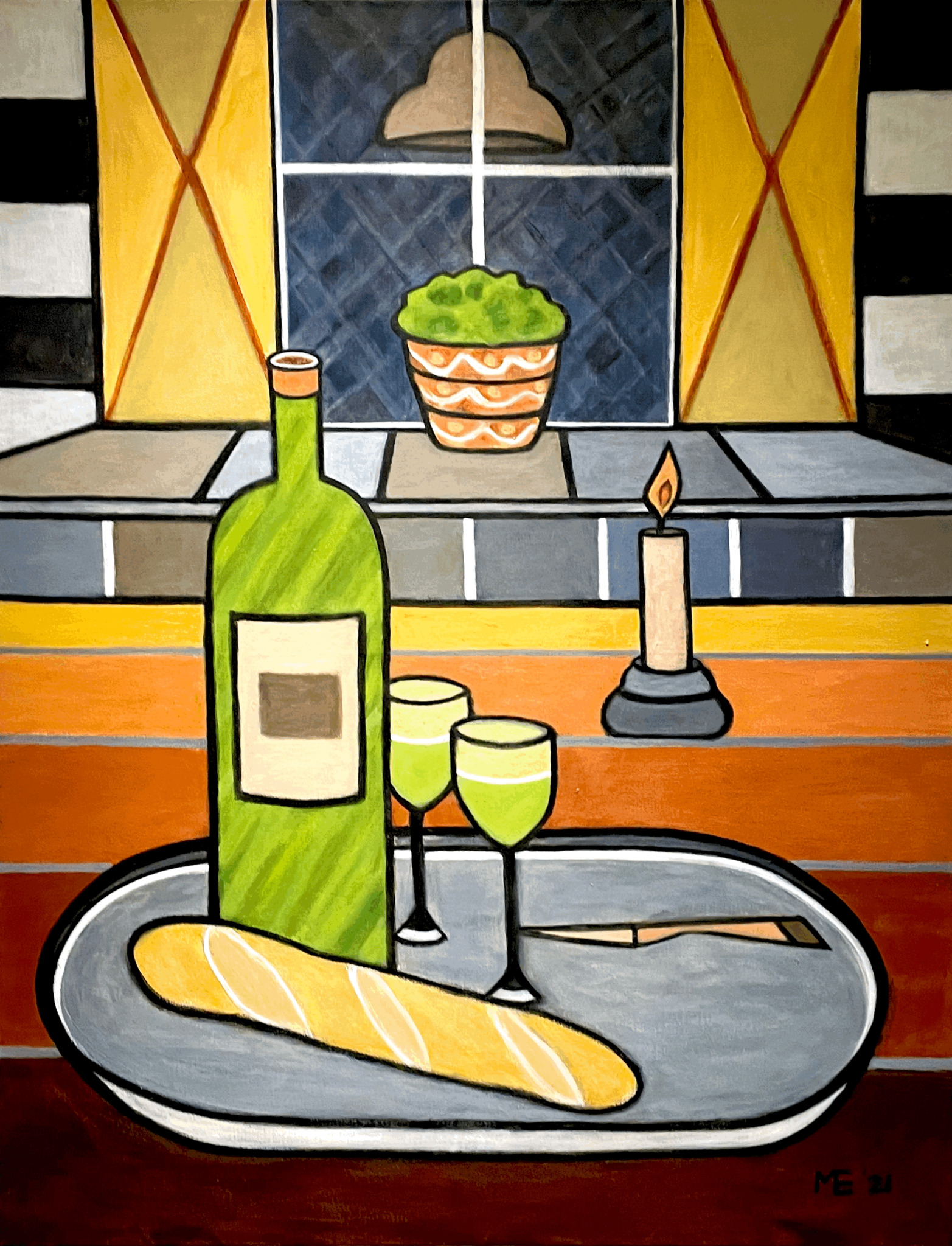 Stilleven met fantasie voorstelling van een gezellig gevulde tafel. In een strakke zwarte baklijst.