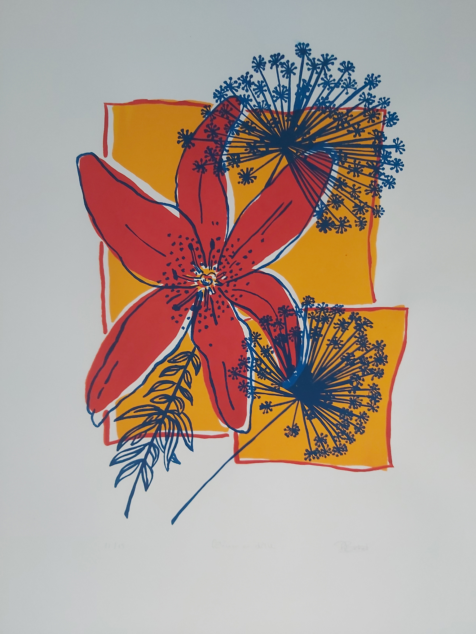 Lilium en Dille, handgemaakte zeefdruk, oplage 15 stuks. Papierformaat is 66 x 48 cm. Beeldformaat is 42 x 30 cm. Leverbaar met of zonder lijst.