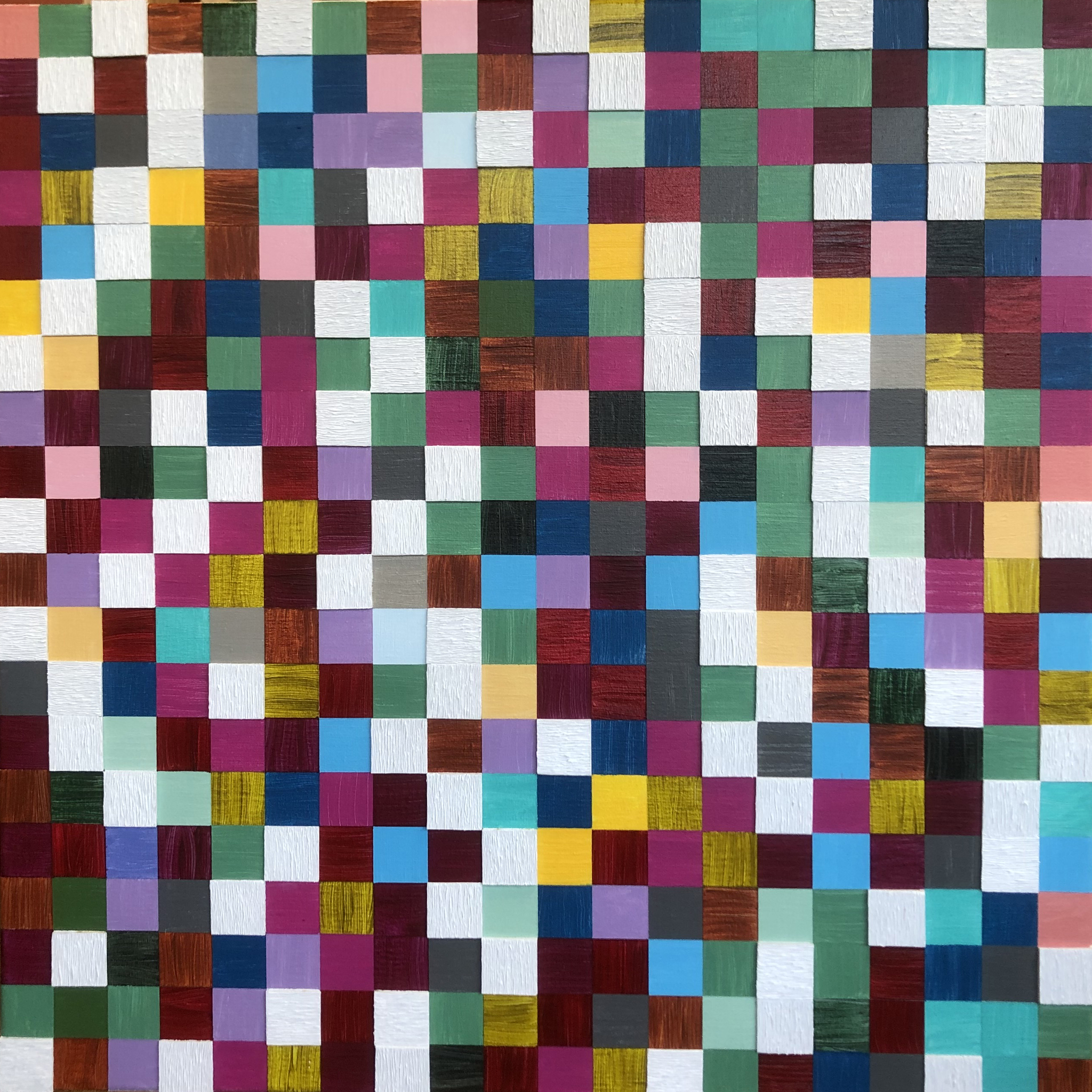 Thema: Chaos (Geometrische Chaos) Mijn kunst is beïnvloedt door de moderne wiskundige en wetenschappelijke benadering van het begrip complexe orde van de natuur. Met name heb ik me verdiept in de Chaos theorie en de fractal geometrie. Ik ben geen wiskundige, en ik gebruik geen wiskundige formules. De ideeën van de Chaos theorie en fractal geometrie leiden tot de ontwikkeling van de composities in mijn werk. Ik gebruik driehoeken,vierkanten en cirkels in mijn schilderijen, maar in mijn huidige serie, geoChao richt ik me alleen op de vierkanten en de verhoudingen tussen de vierkanten. Ik ontwikkel mijn composities door kleine vierkantjes op grote te zetten of grote op kleine te zetten. Het gaat om de onderlinge verhoudingen tussen de vierkanten. Ik laat de methode die ik kies de compositi