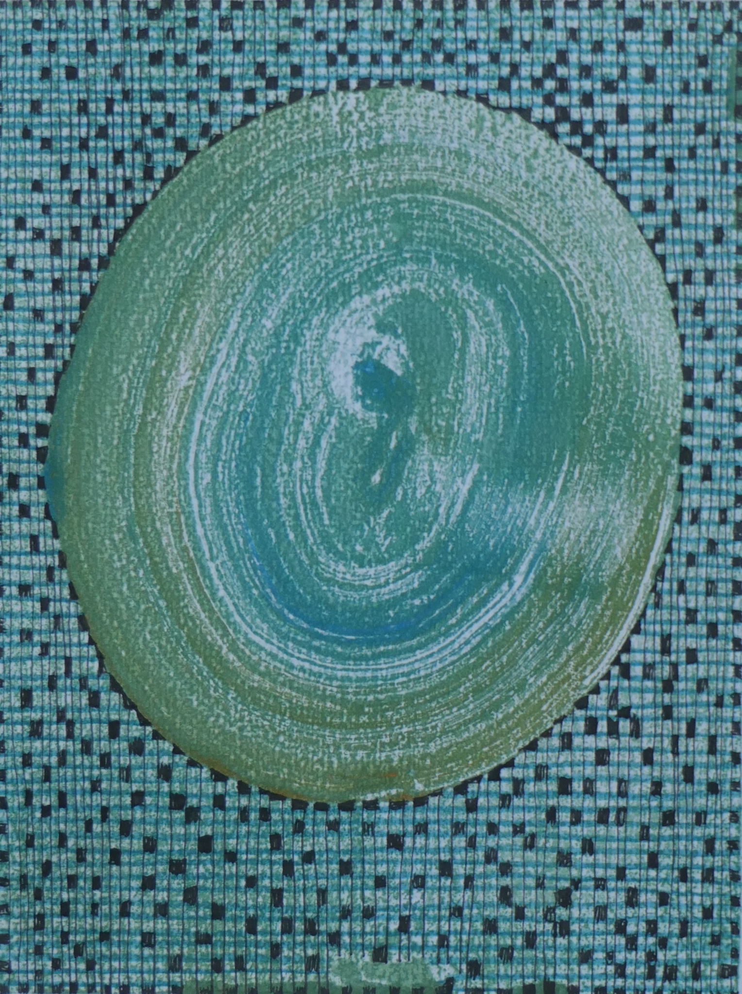 Monoprint met acryl, inkt en kleurpotlood met passe partout in lijst, A4.