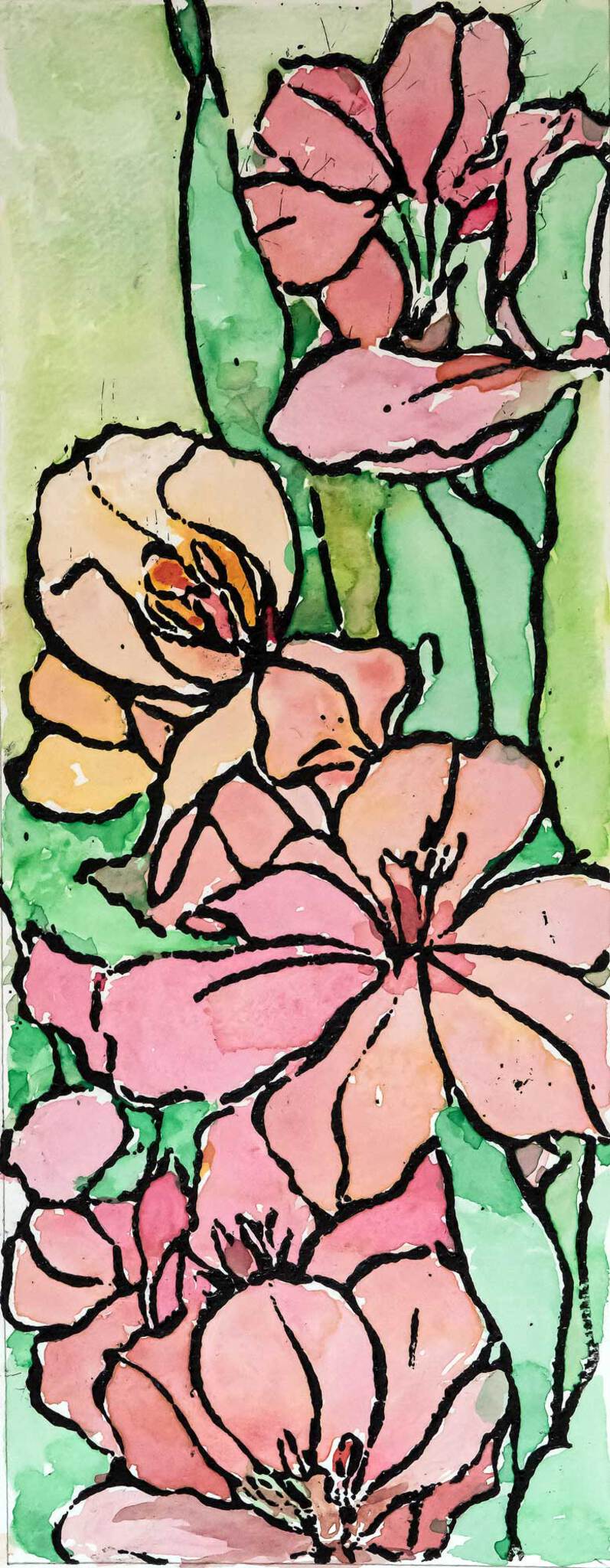 Linosnede, met oliehoudende inkt afgedrukt en geaquarellerd. Ingelijst met een smal zilverkleurig houten lijstje, met passe partout en glas dat 45% ultraviolette straling tegenhoud.