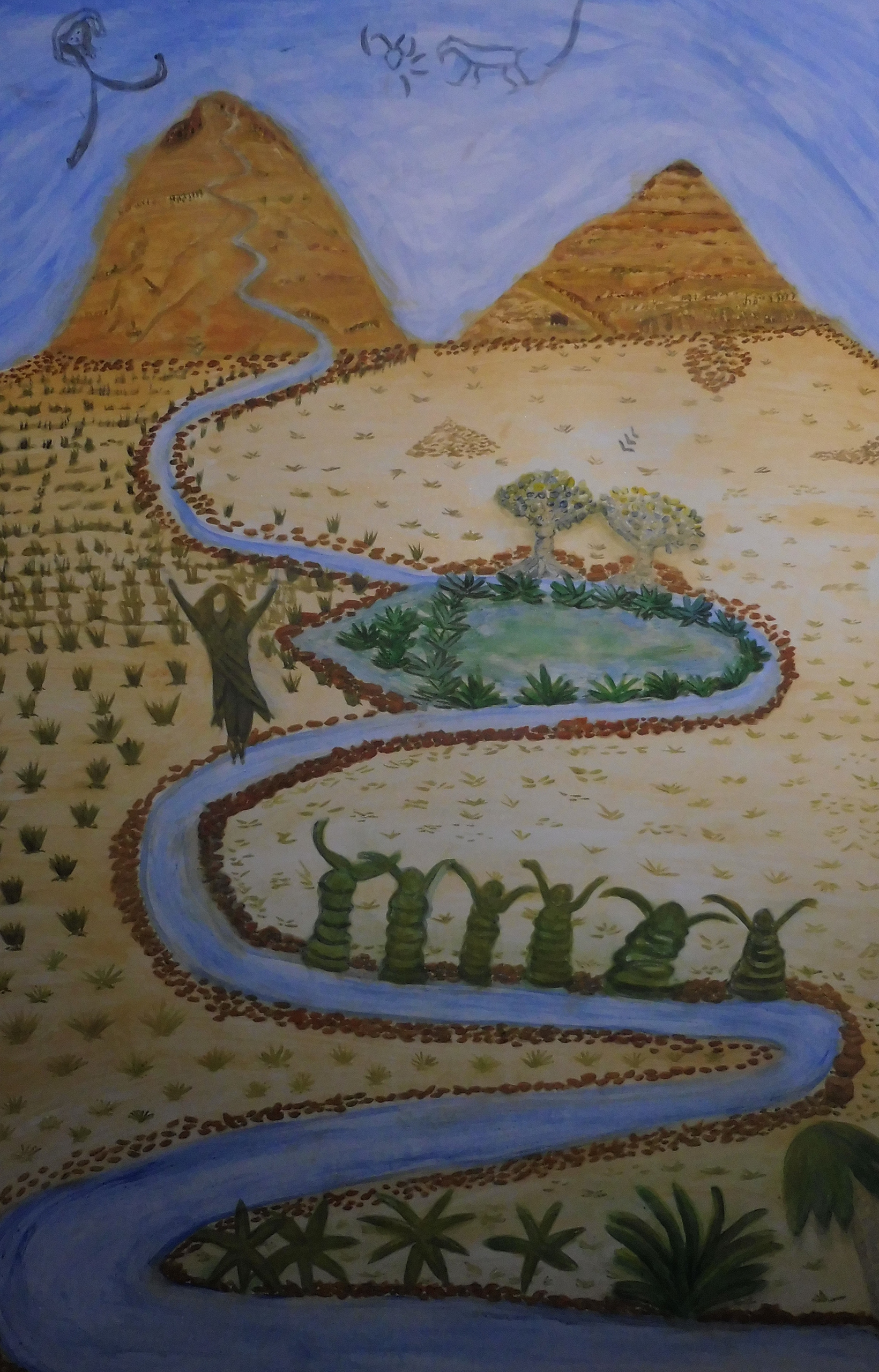 Nieuw Nieuws Rivier Oase Woestijn Vrede Bovennatuurlijk Ware Kinderen Waarheid Geest Aanbidding Aanbidders Zonen Olieverf Groen Geel Bruin Blauw Grijs