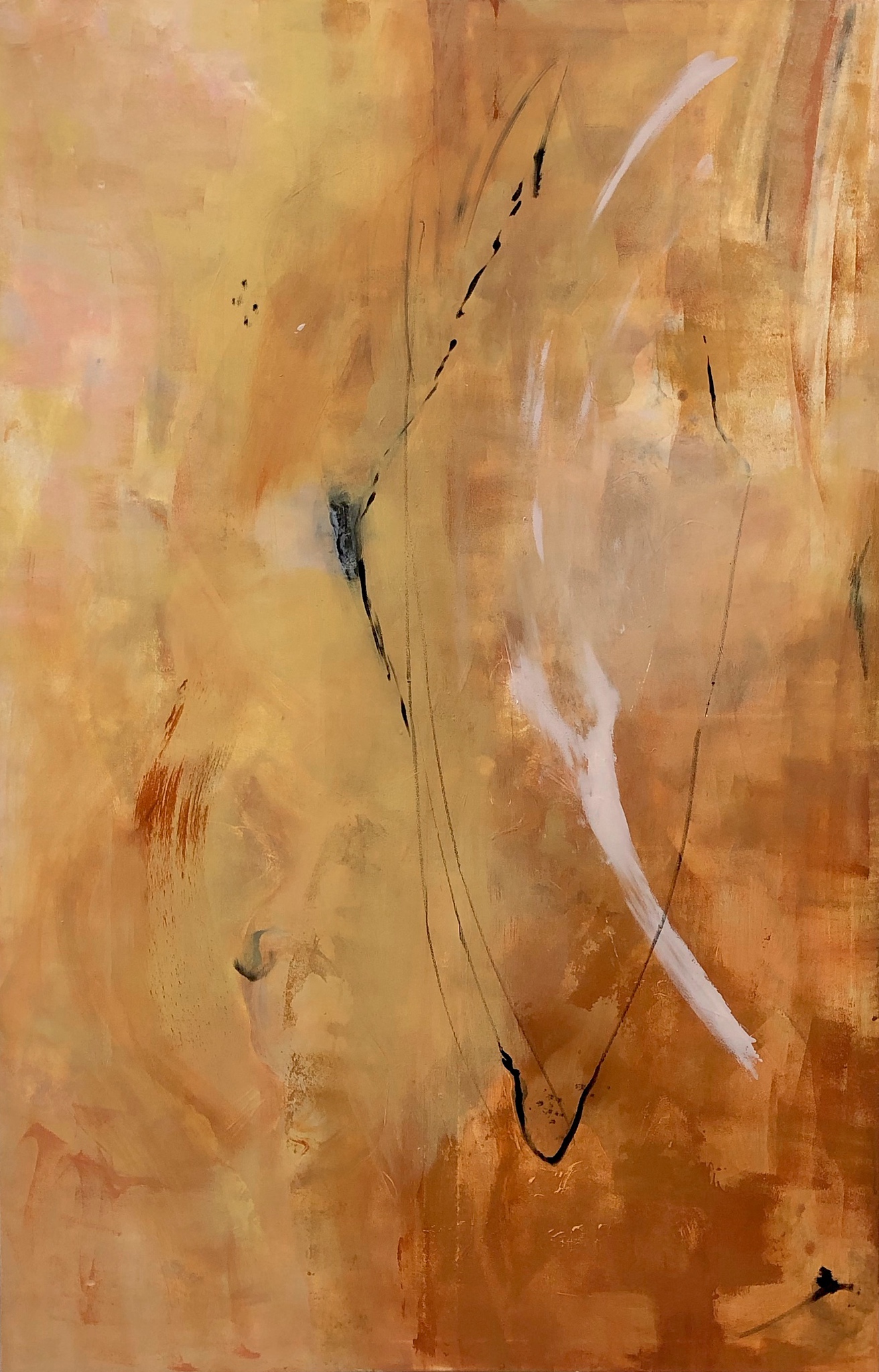 Soms wil een schilderij niet. Een proces van toevoegen en weghalen begint. Ik draai het werk ( voordeel van abstract). Ik voeg toe, haal weer weg. Oudere lagen tonen zich. En dan ineens is het er. Warme kleuren en mark making, een omhelzing