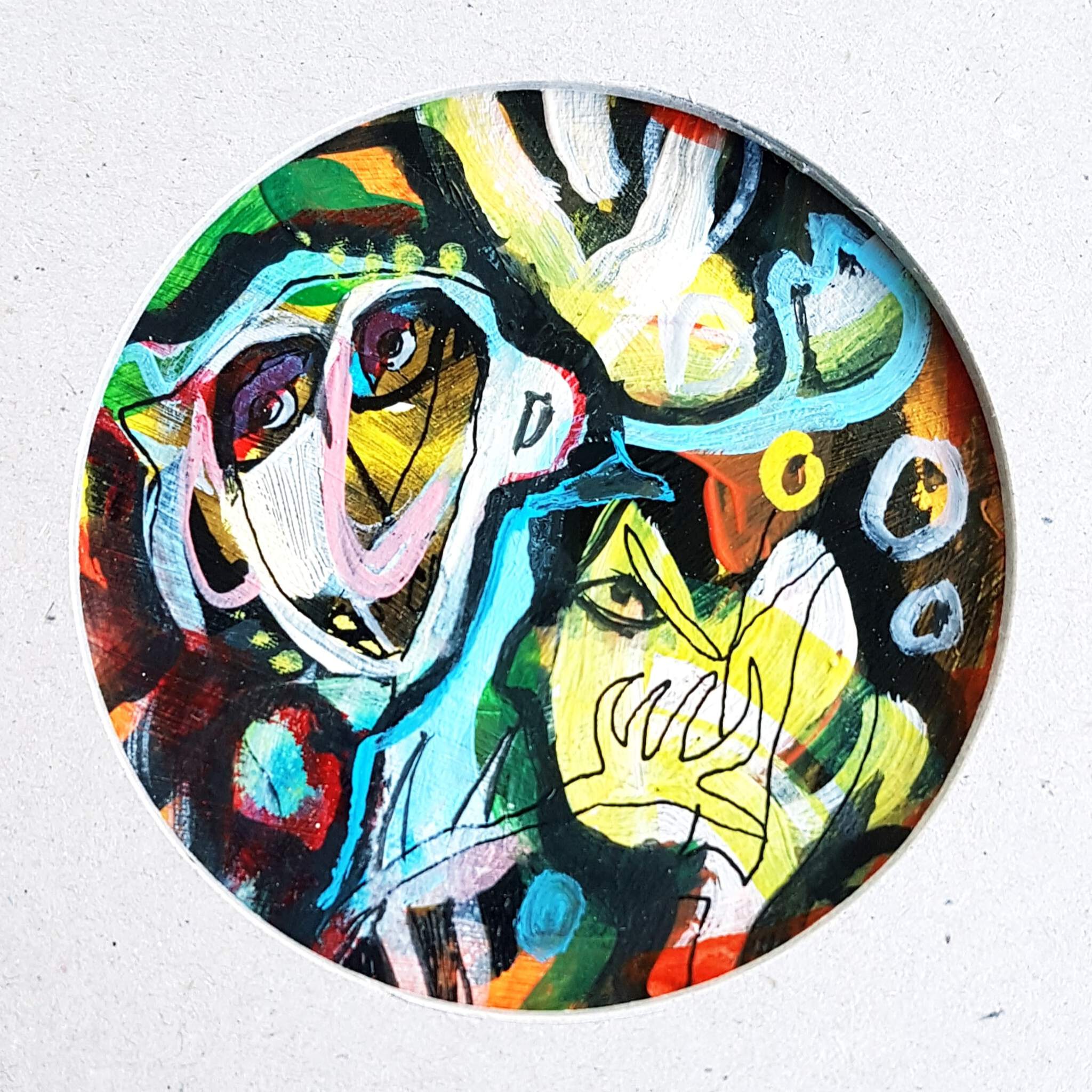 Moderne kunst op een bierviltje. Ingelijst in naturel passe-partout A5 formaat