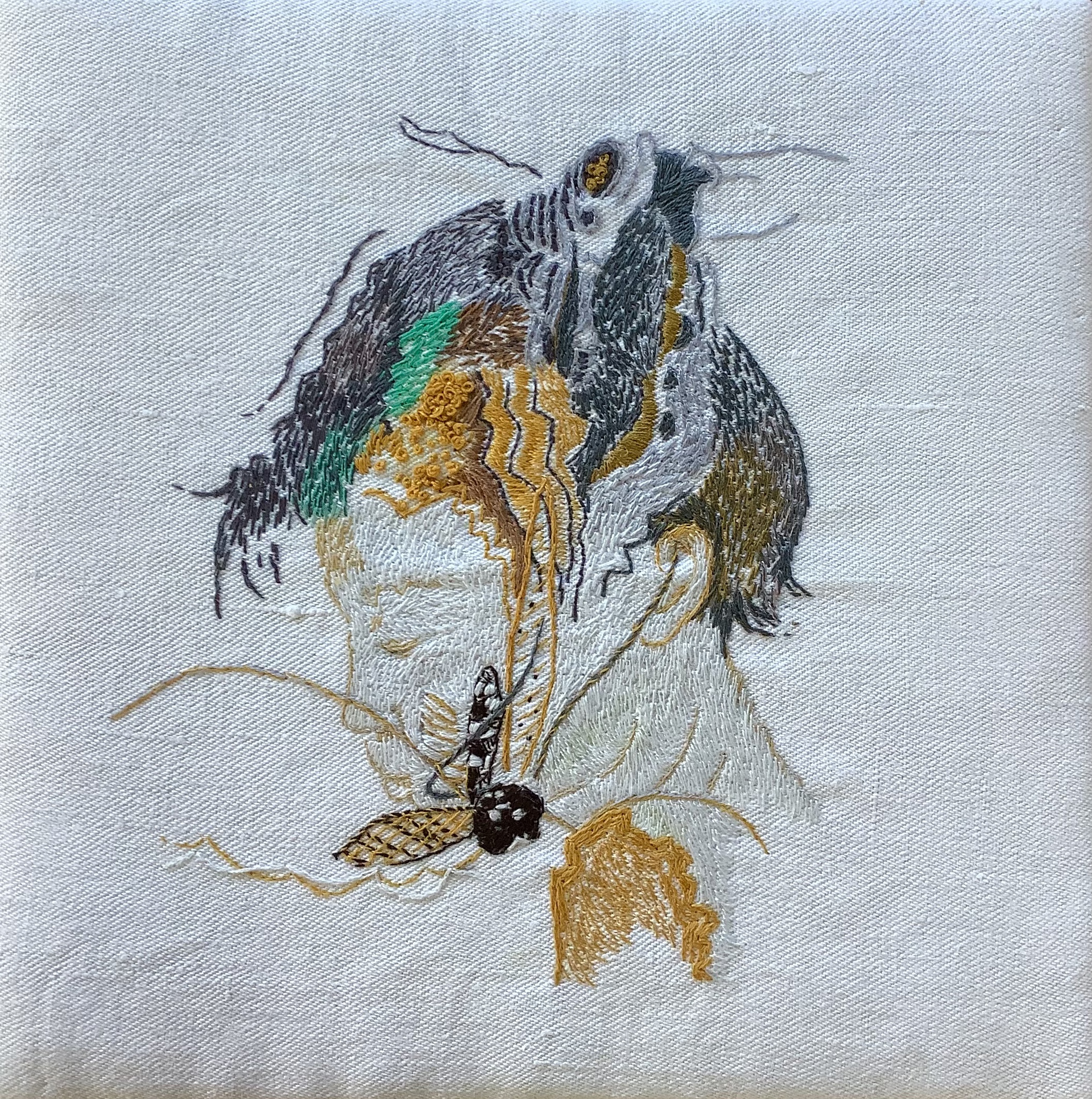 Geïnspireerd op het boek, 'daar waar de rivierkreeften zingen' de hoofdpersoon is Kya. Ze is onderdeel van de natuur. Het weerspiegeld voor mij de grote zorg om de natuur. Geborduurd op een antiek deel van een waszak uit de 1e WO Formaat, 25x25 cm dmc garen handgeborduurd.