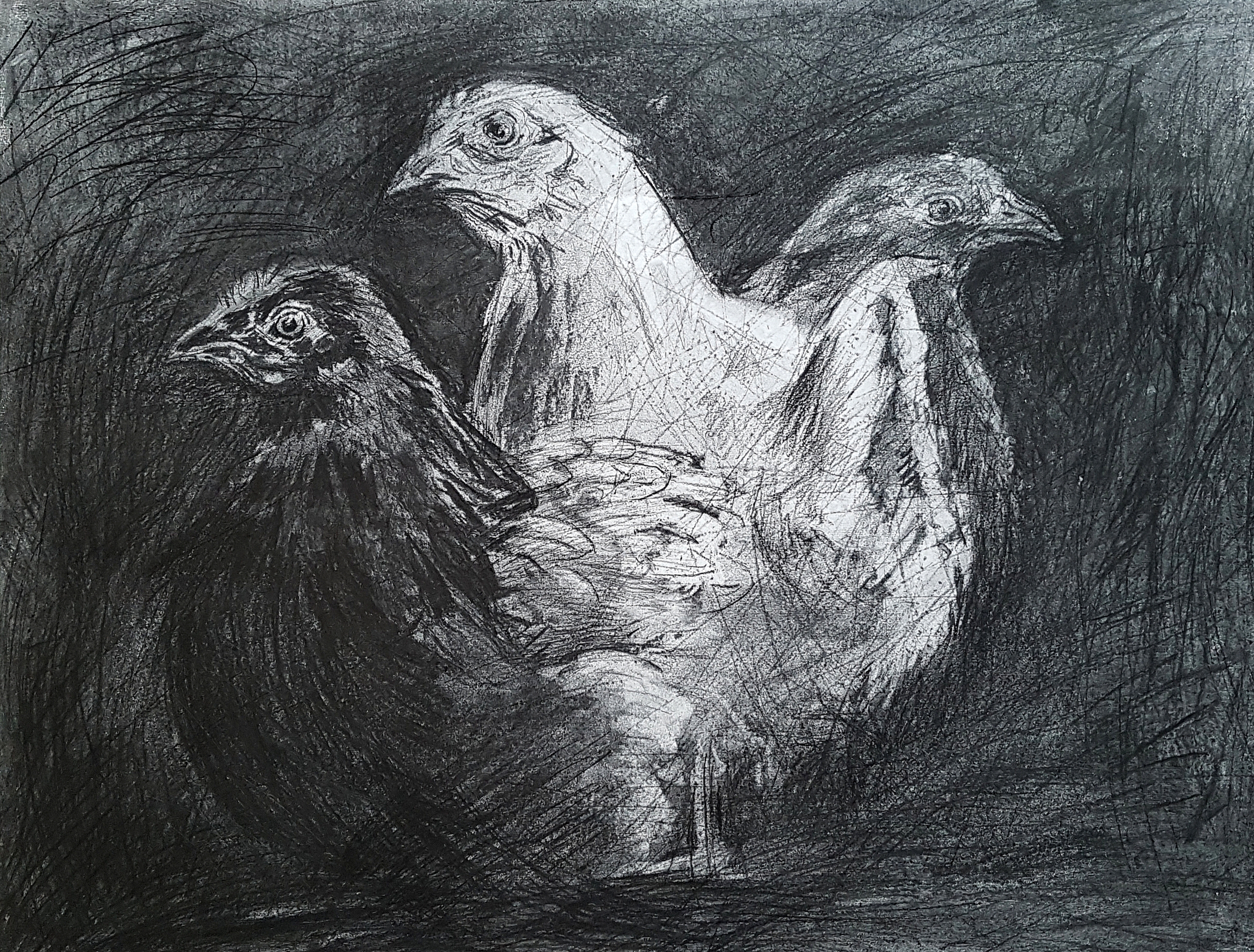 Houtskool Groepsportret Kippen Chickens Drie-eenheid Charcoal Houtskooltekening Zwart Donker