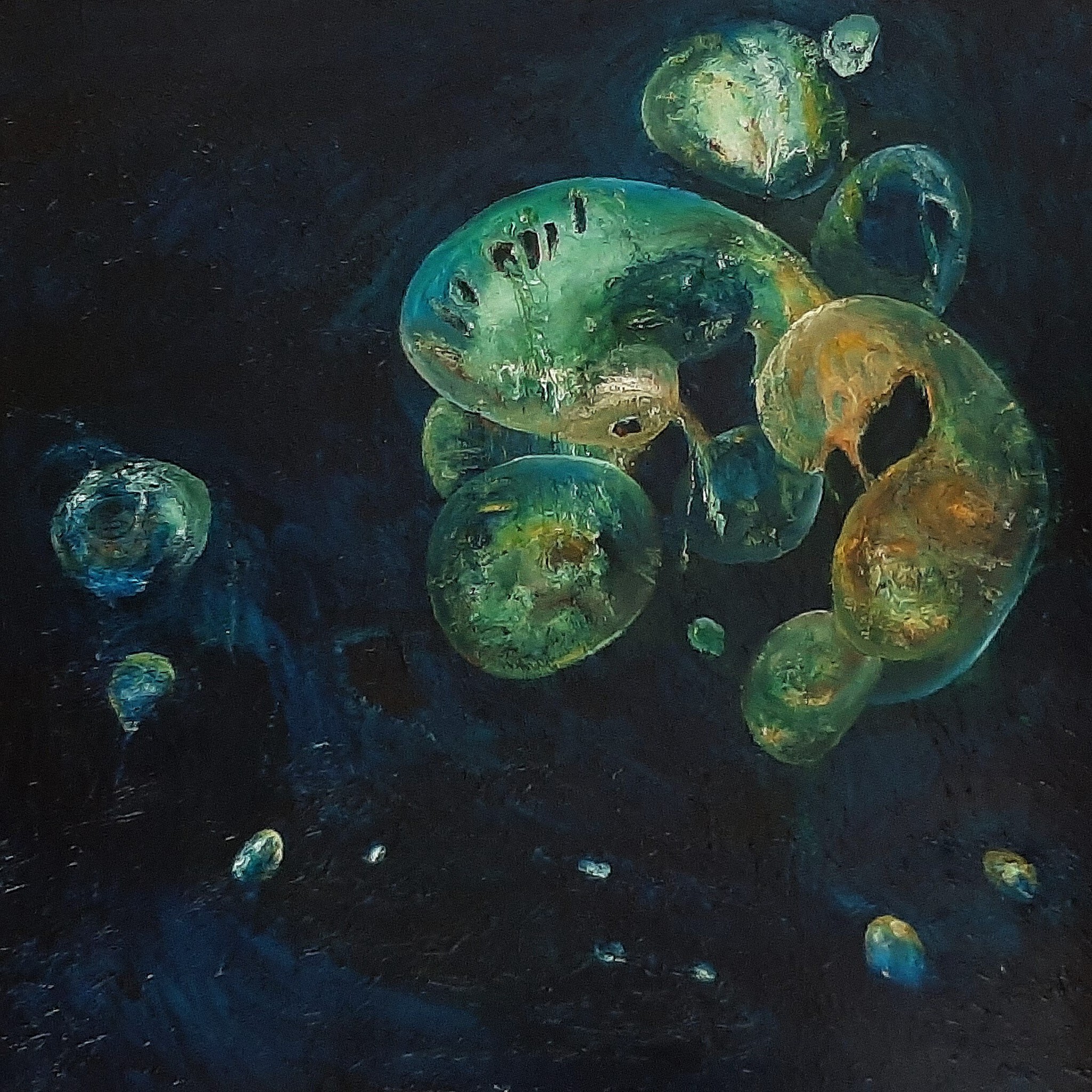 Een tijd lang geen uitbreiding gehad in mijn reeks A SPACE ODYSSEY. Maar werkend (met lange tussenpozen) aan mijn sub-reeks ‘Out of the Blue’ kom ik via een virtuele galactische bocht toch weer terug in de ruimte. Maar in dit geval niet in de macrocosmos van het heelal, maar in de microcosmos. Dieper de cel in, een ries door de moleculen. Maar toegegeven, ook Stanley Kubrick’s film 2001 A Space Odyssey speelde een rol. Met name de caleidoscopische trip naar Jupiter, begeleid de al even hallucinerende muziek (o.a. Lux Aeterna) van de Hongaarse componist Györgi Ligeti, was mijn inspiratiebron. Al meer dan een jaar stond mijn ‘Virtual Spaces’ op de bok. Uiteindelijk nog een paar kleine veranderingen aangebracht. Het ik af. Voorlopig. Maar de ruimte blijft eindeloos. Dus wie weet, ik blijf reizen door het universum. De prijs is exclusief lijst;