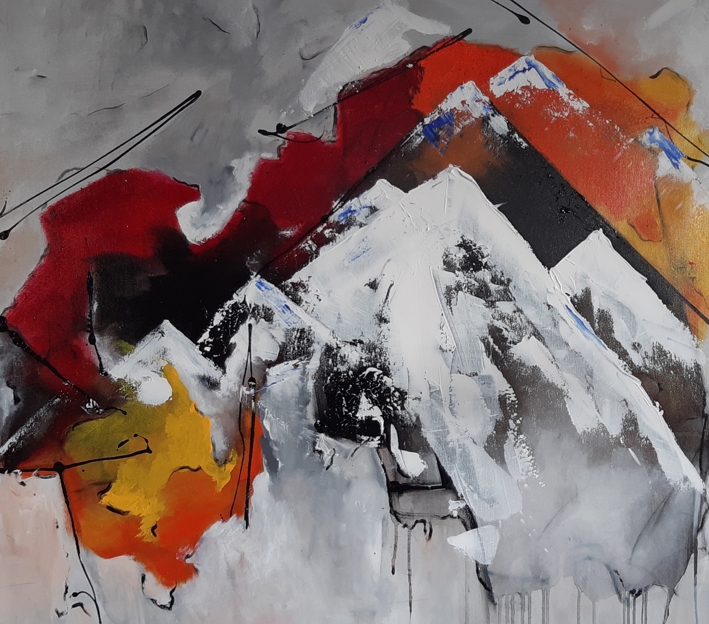 Sneeuwtoppen. Winterlandschap met sneeuwtoppen . Geabstraheerd naar de werkelijkheid. Onderin is er al smelting van de sneeuw. .Veel acryl-sponstechniek. Winterkleuren , veel wit grijs oranje