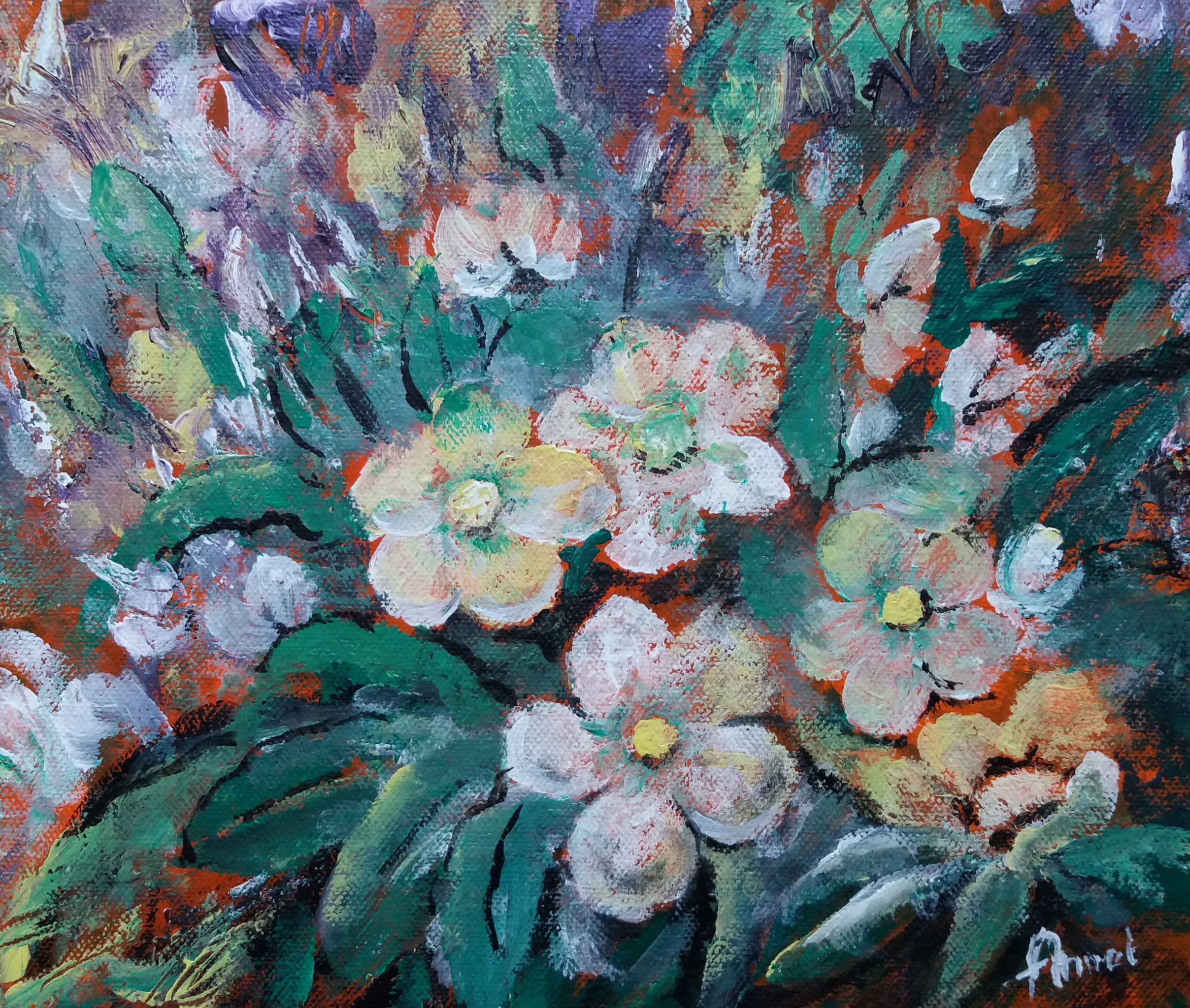 Een impressie van de helleboris, witte kerstroos, deze schilder ik en hierna wordt de plant in de tuin geplaatst, Vrolijk klein werk en vast passend in vele interieurs