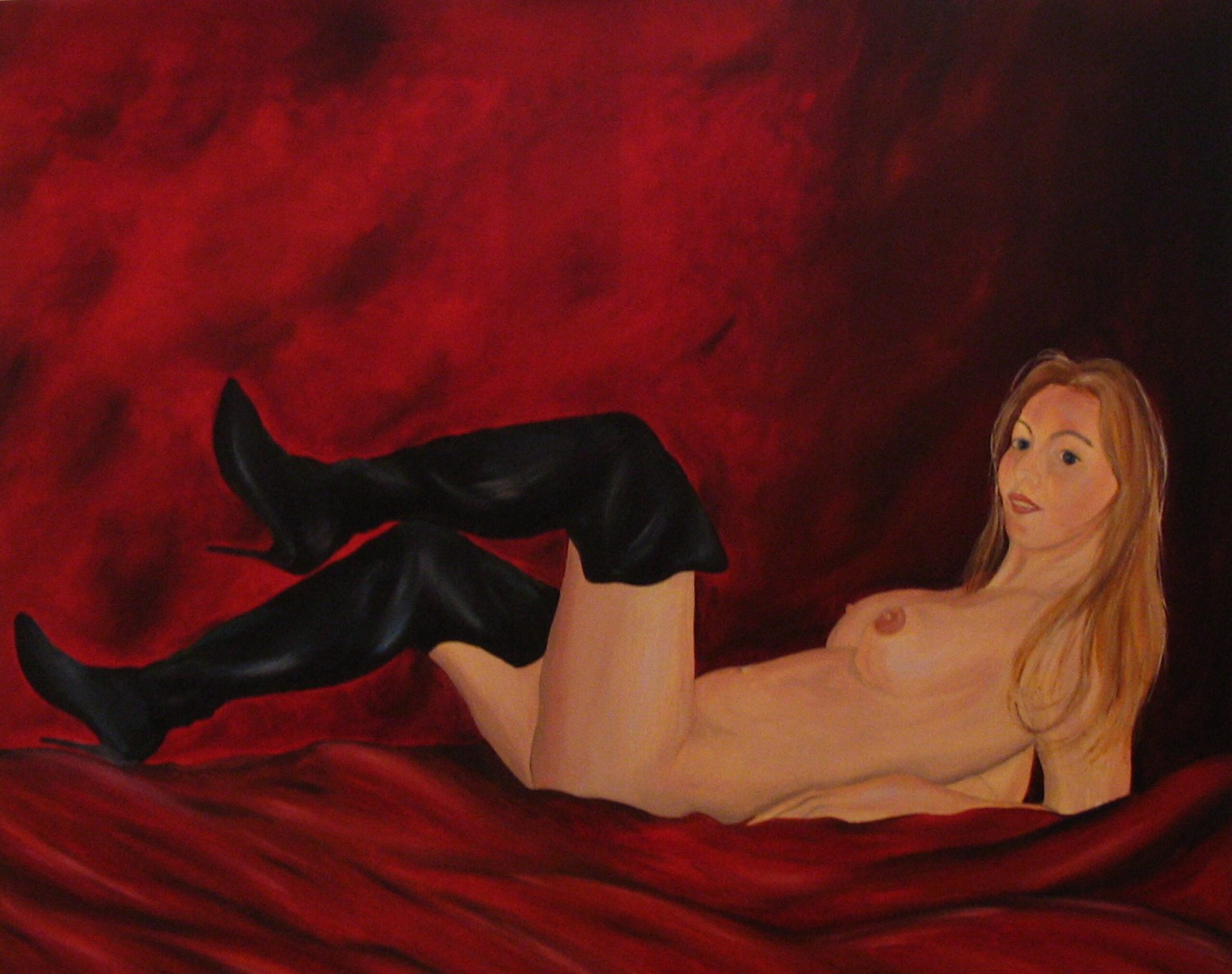 Chantal slechts gehuld in zwarte laarzen. Doek in opdracht vervaardigt voor de verjaardag van haar man