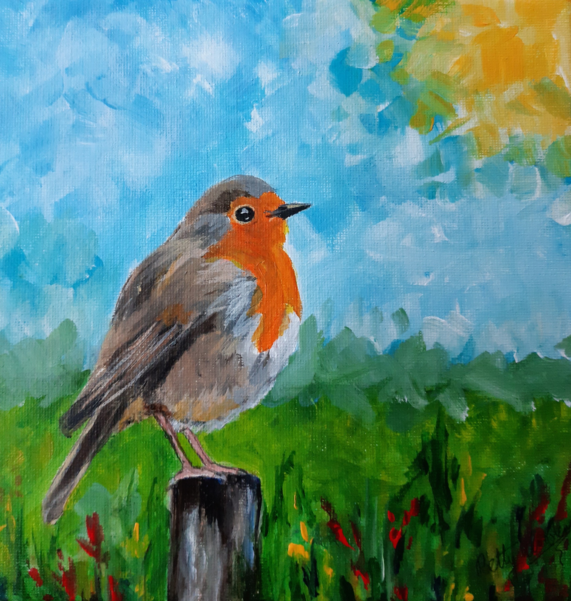 Klein schilderijtje van een roodborstje, losjes geschilderd met acrylverf. Aan de achterkant voorzien van een staaldraadje om het op te kunnen hangen.