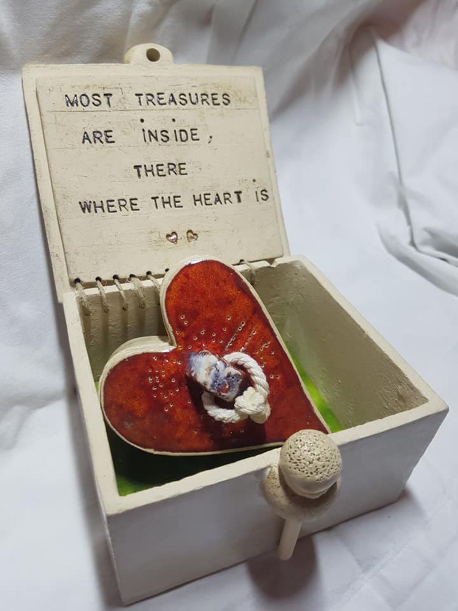 Cremekleurig gedenkdoosje met slotpin. Binnenin een hartvormig doosje. Tekst aan de binnenkant van het deksel: Most treasures are inside, there where the heart is!