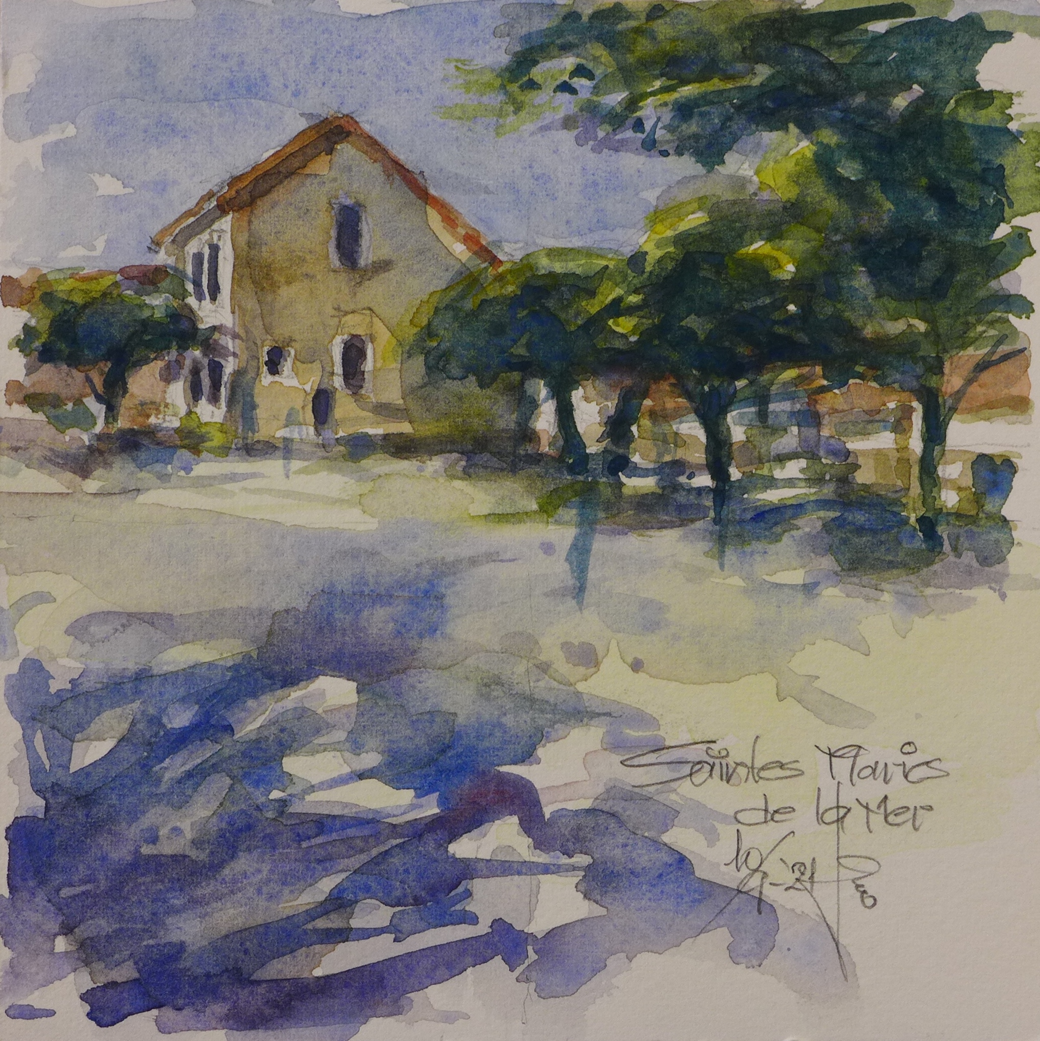 Een aquarelschets van een plaatsje in Zuid Frankrijk.