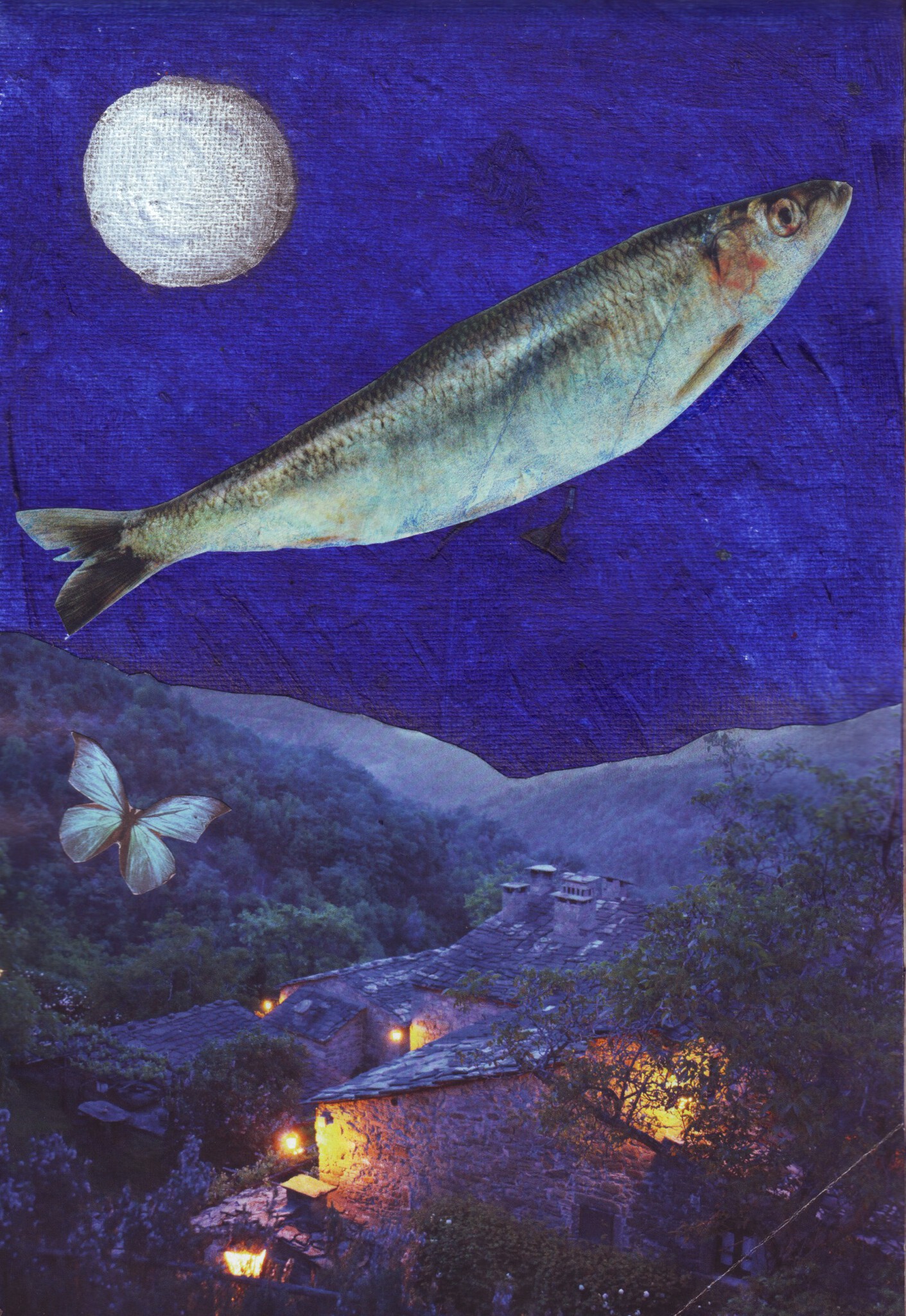 Blauw Acryl Vis Nacht Maan Collage Rouw Heimwee