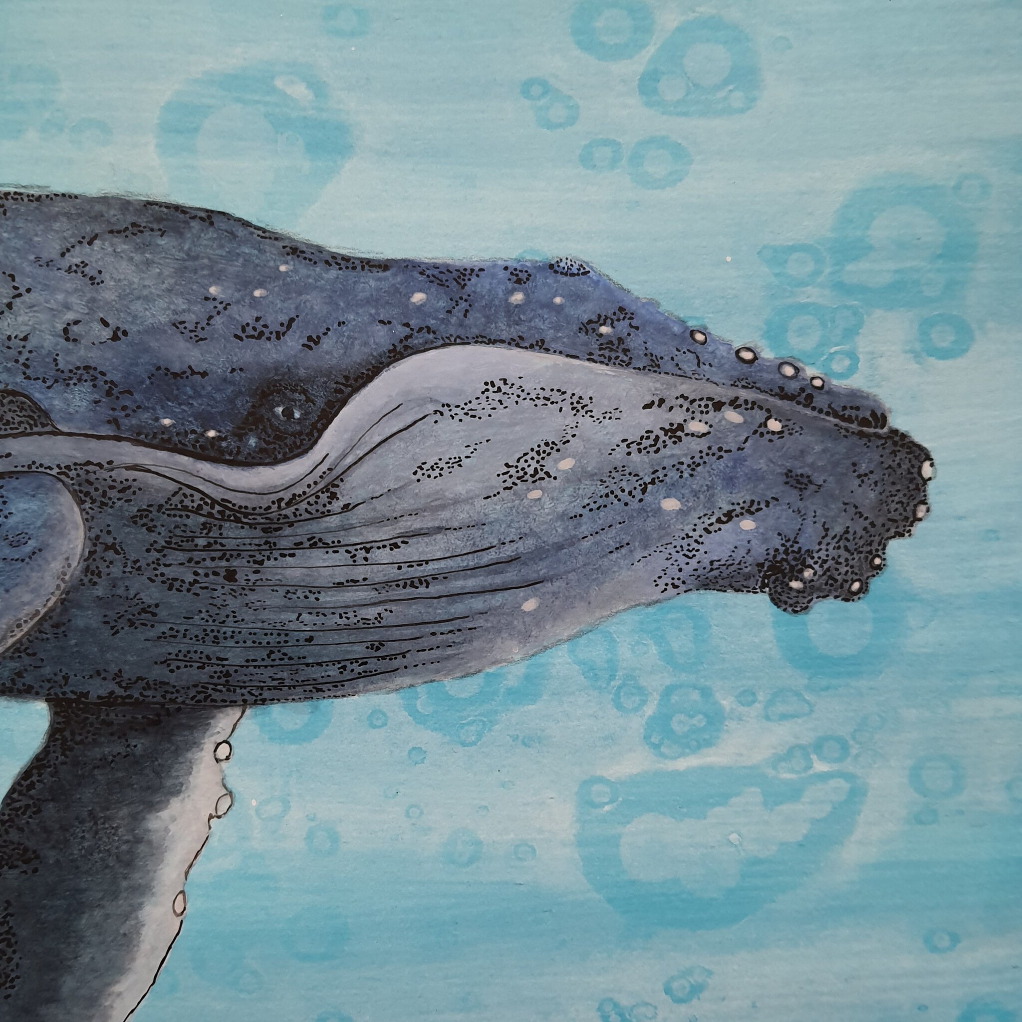 Een walvis portret geschilderd op een monoprint. De bultrug glijdt door het heldere water naar koele wateren.