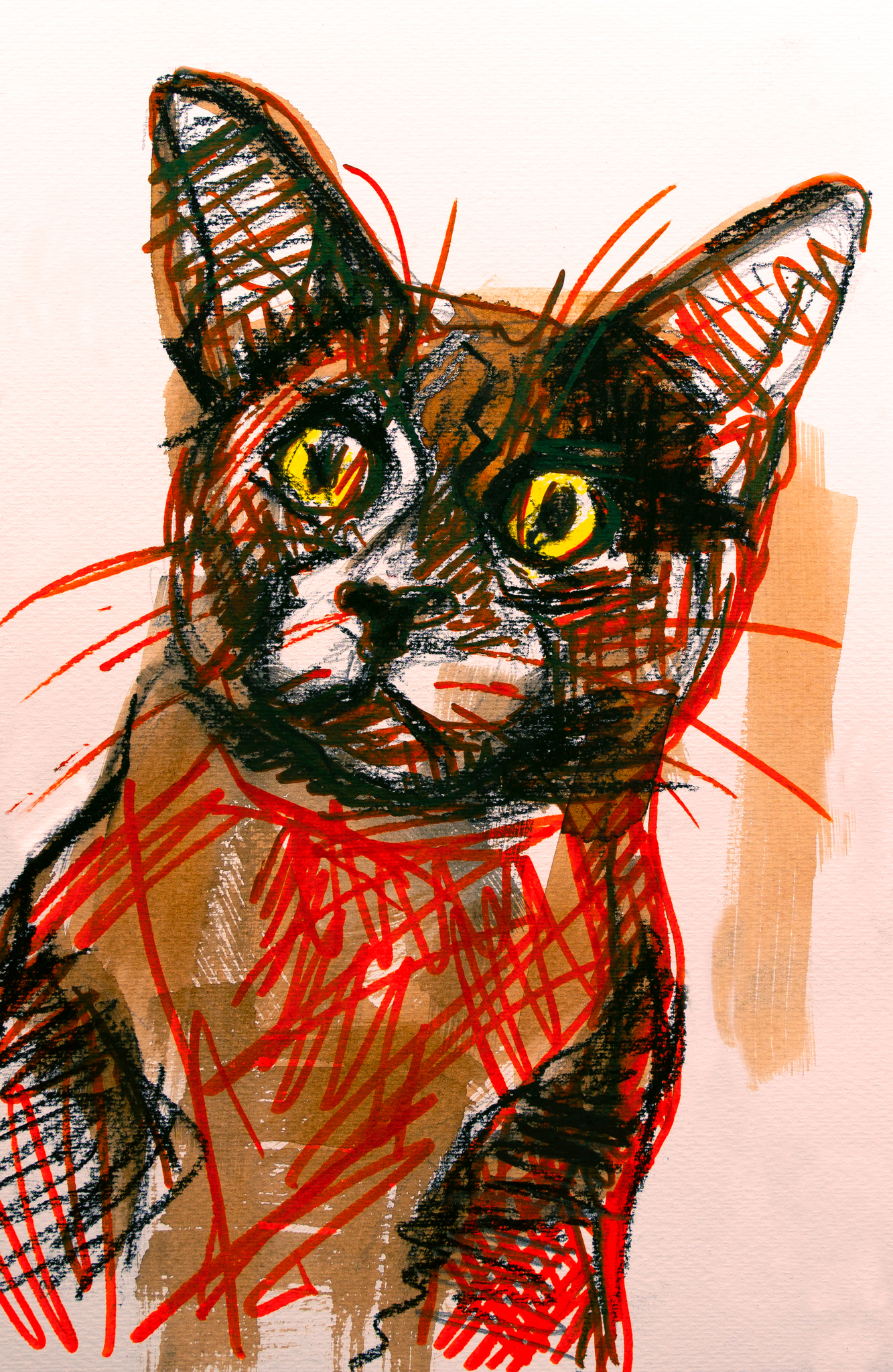 Schets van een kat, inkt, houtskool, marker op papier, in wit lijstje