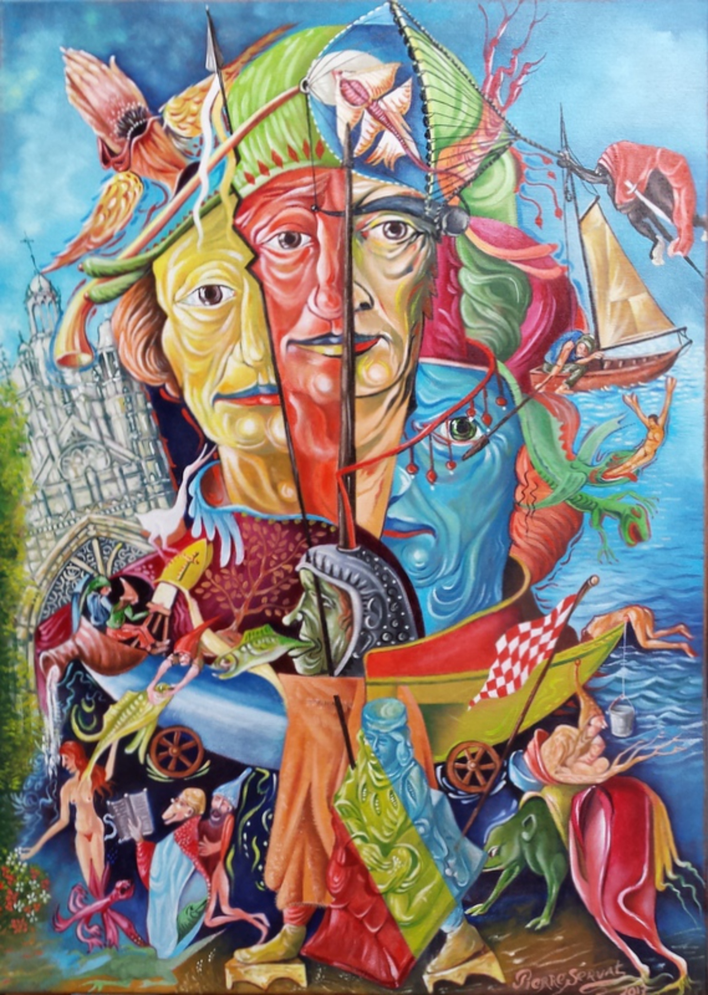 This picture is inspired to Jeroen Bosch and is painted with iol-colour on linen,measurement by 70 x 50 cm. I chooses conscious the colours red, blue, green and yellow, the colours of Carnaval in 's Hertogenbosch. I let my phantasy own free course and this painting is the result. Please you can react right under to the artist.
