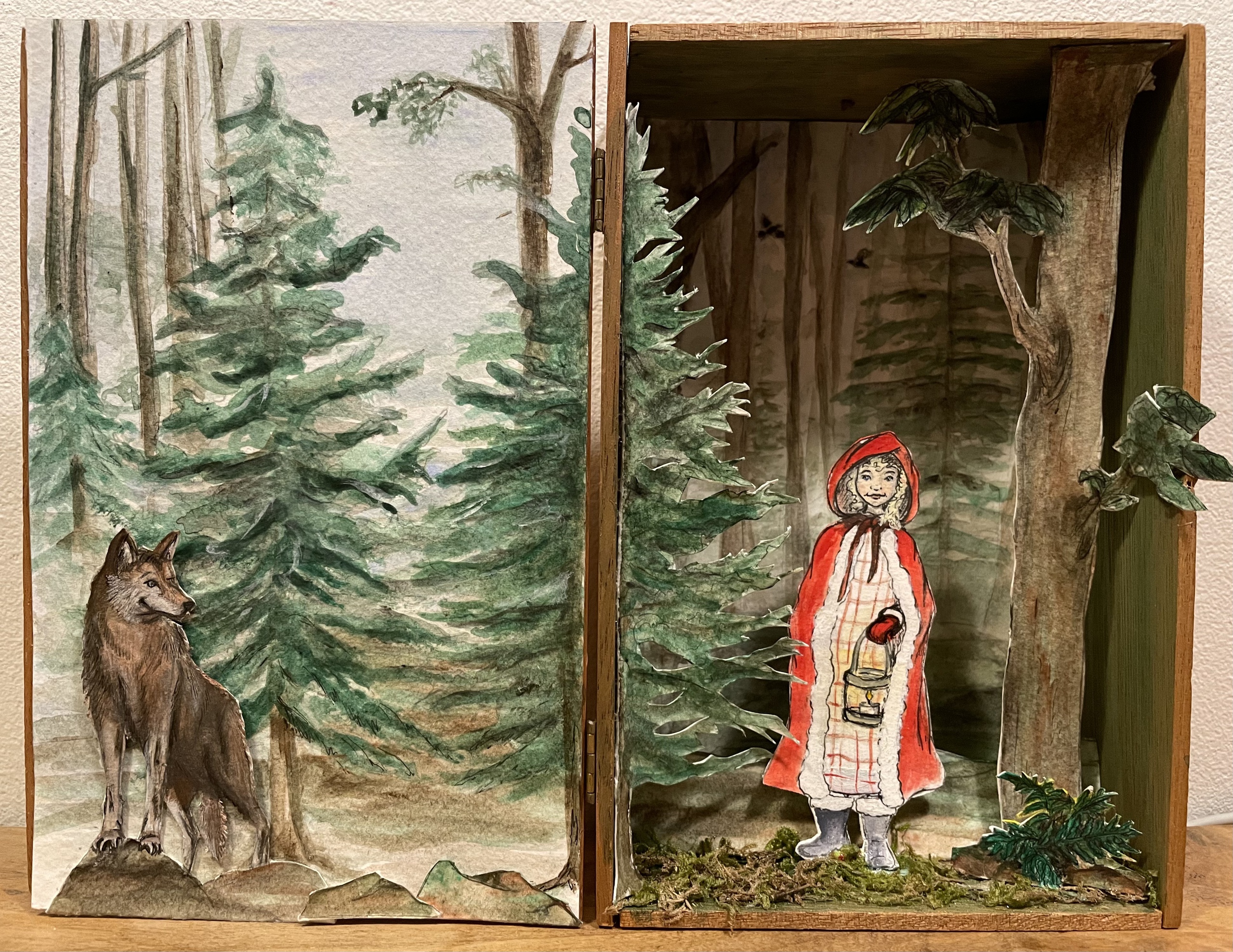 Aquarel illustratie van Roodkapje en wolf in ' Corona' sigarendoosje. Alle illustraties zijn gemaakt op een zware kwaliteit aquarel-papier, uitgesneden en vervolgens in het doosje geplakt. Onder de voeten van Roodkapje is wat gedroogd mos aangebracht.