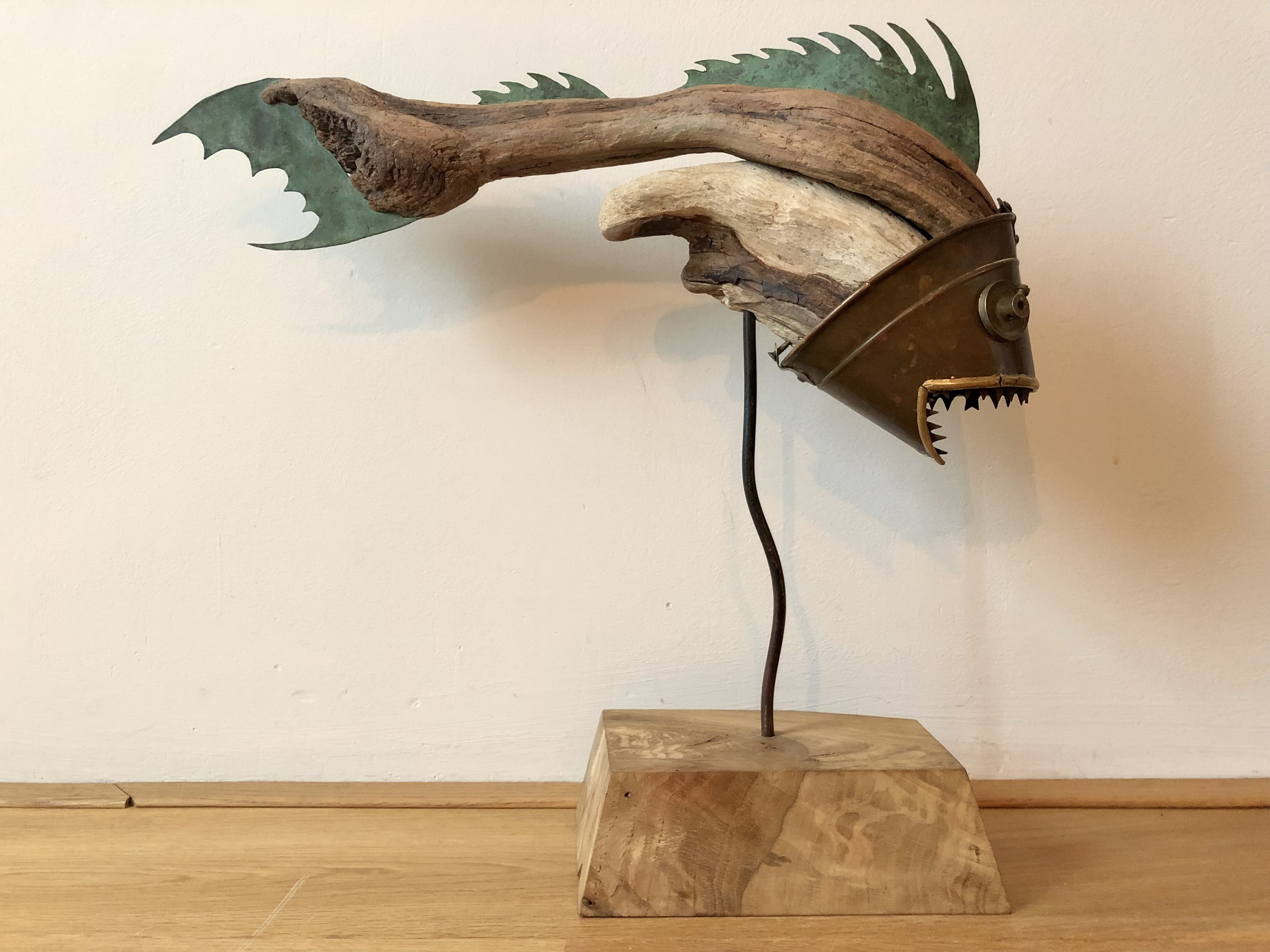 Maakt vissen. Vissen van drijfhout, wrakhout, vindhout en zaagafval. En natuurlijk oude verfblikken, koperen meuk, moertjes, knopen en alles wat verder nog onder schroot valt. En beleeft daar een kinderlijk plezier aan.