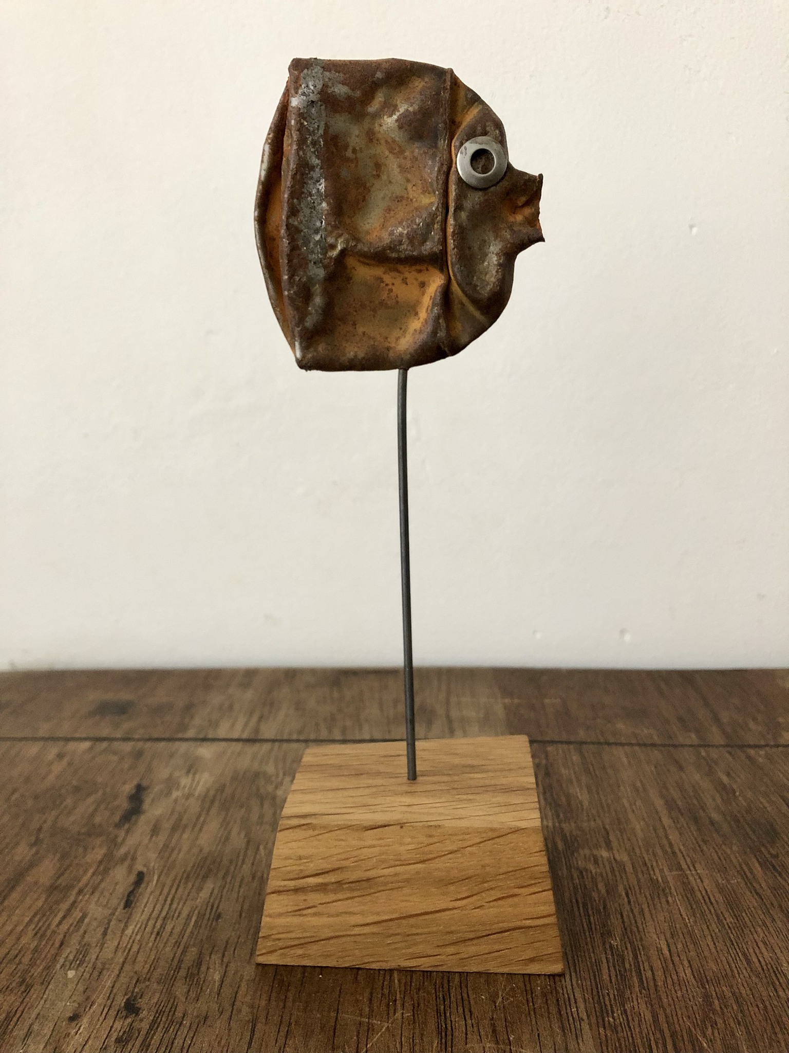 Maakt vissen. Vissen van drijfhout, wrakhout, vindhout en zaagafval. En natuurlijk oude verfblikken, koperen meuk, moertjes, knopen en alles wat verder nog onder schroot valt. En beleeft daar een kinderlijk plezier aan.