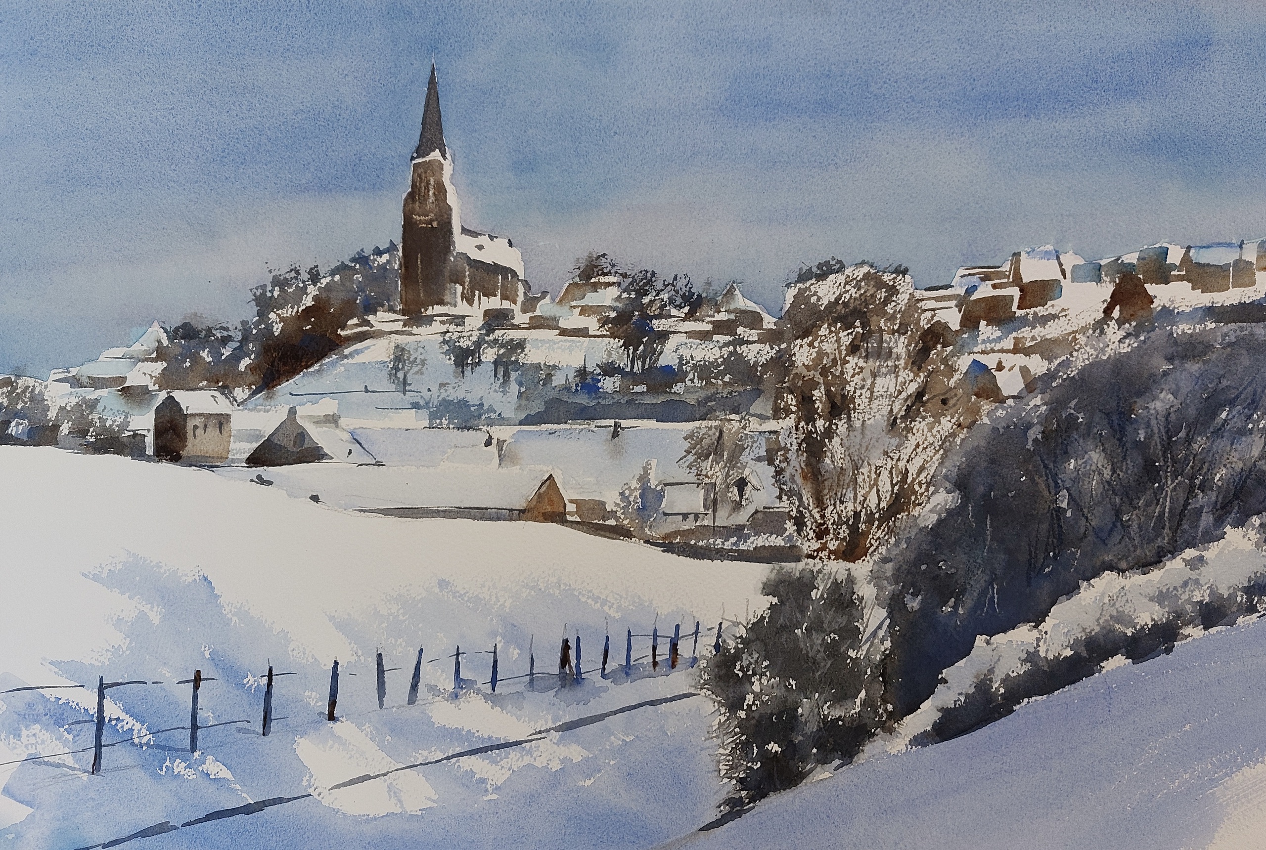 Aquarel Sneeuw Waterverf Bergdorp Kouwenhoven Vijlen Zuid-limburg Aad