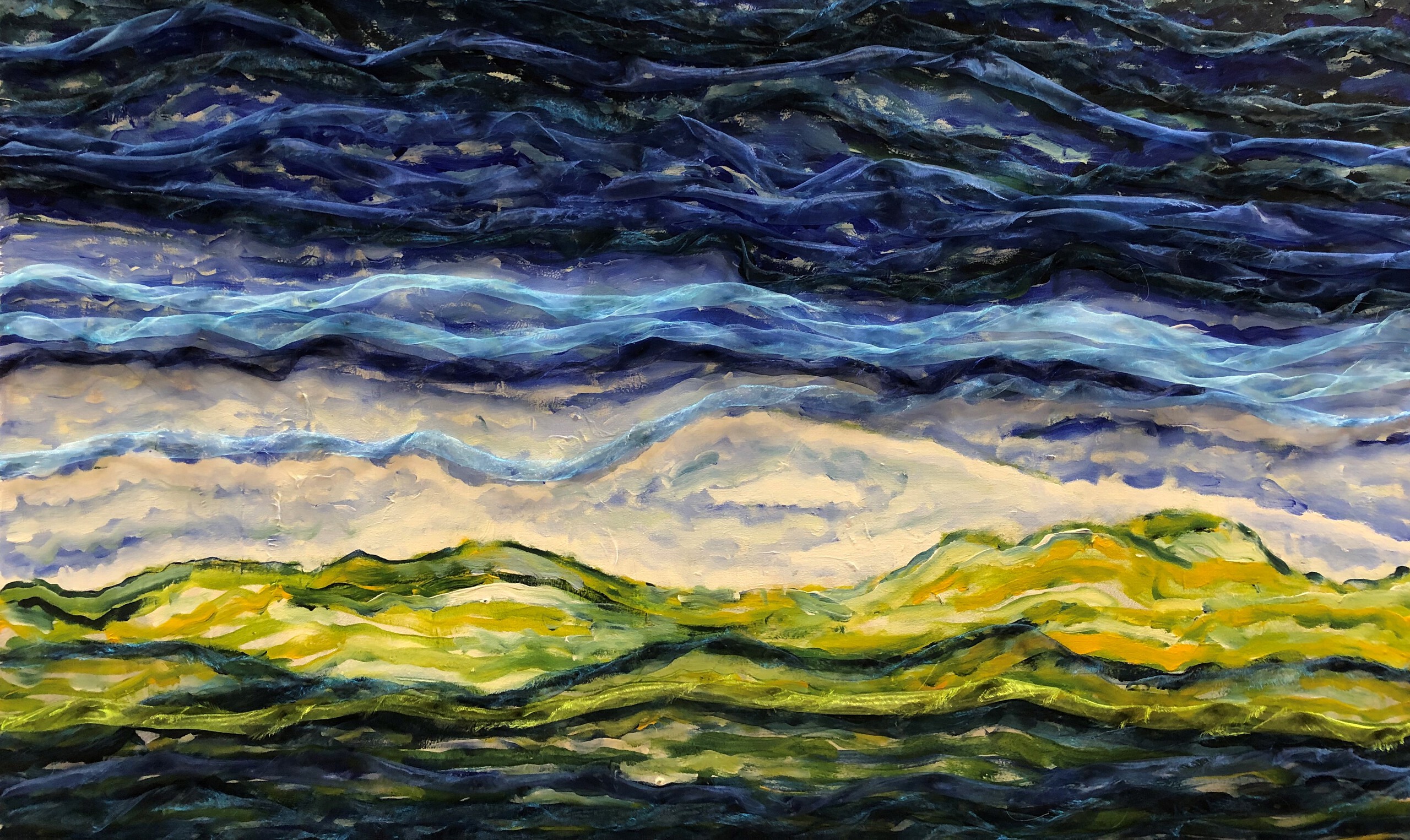 Dit schilderij is ontstaan nav een korte vakantie op Schiermonnikoog. Er zijn daar enorme vergezichten. De rust, ruimte, weidsheid van het landschap hebben mij geïnspireerd. Mixmedia, acryl en textiel op doek. Landscape dancing door Gita Kalishoek (2021) : Andere media Acryl, Collage op Hout - SINGULART